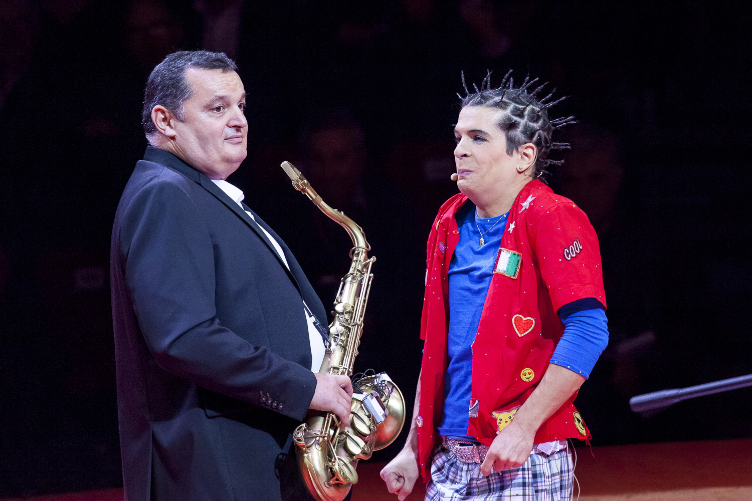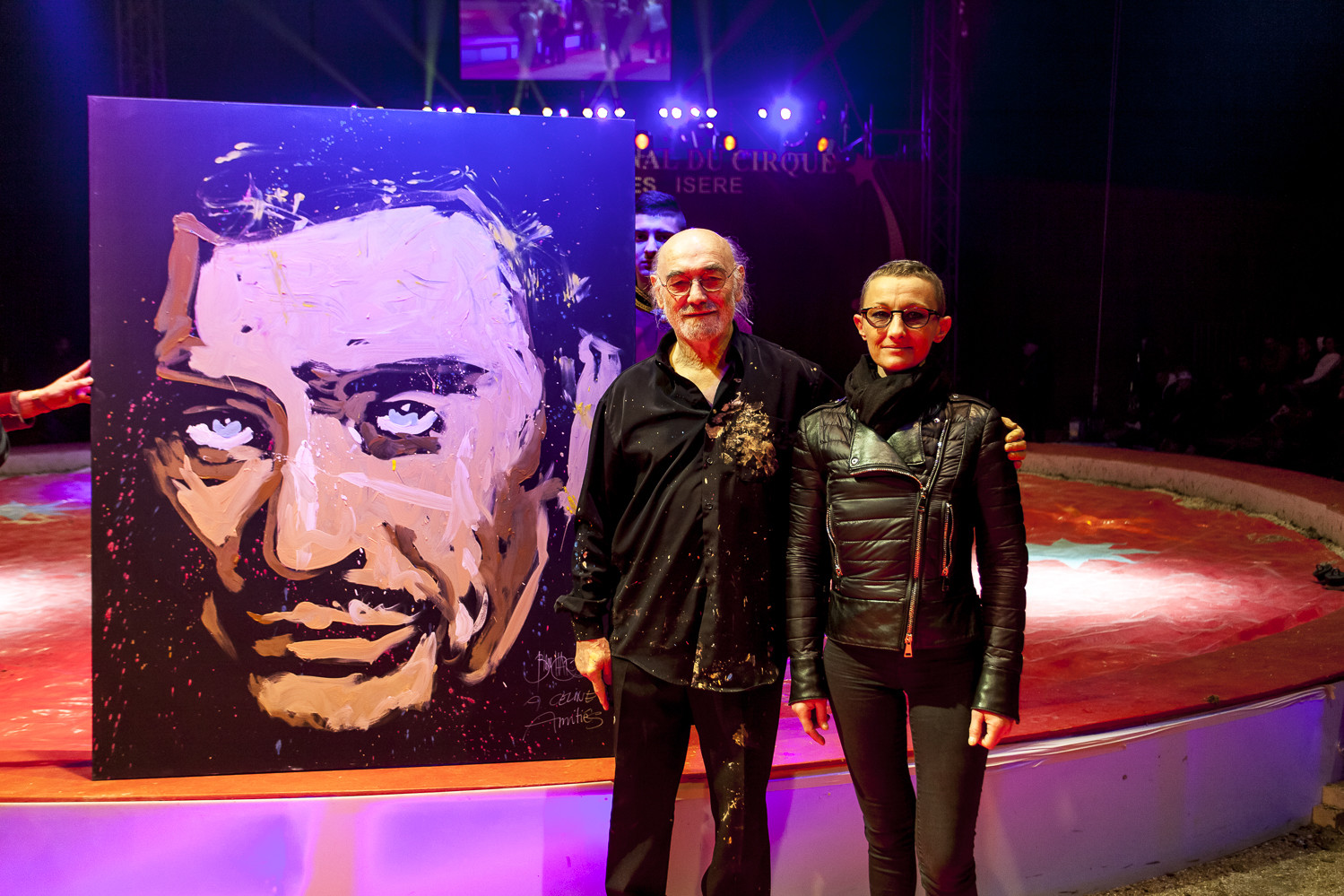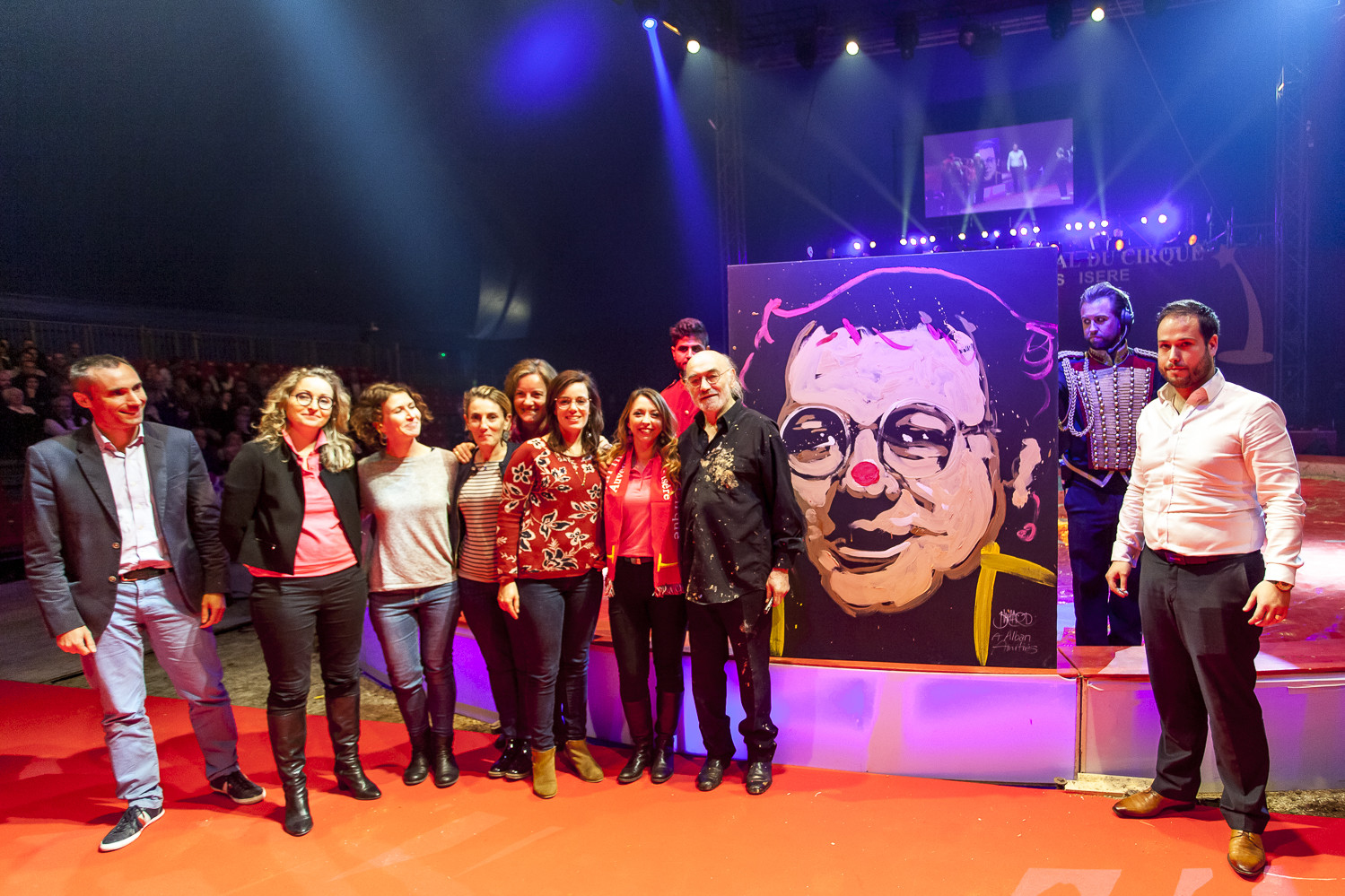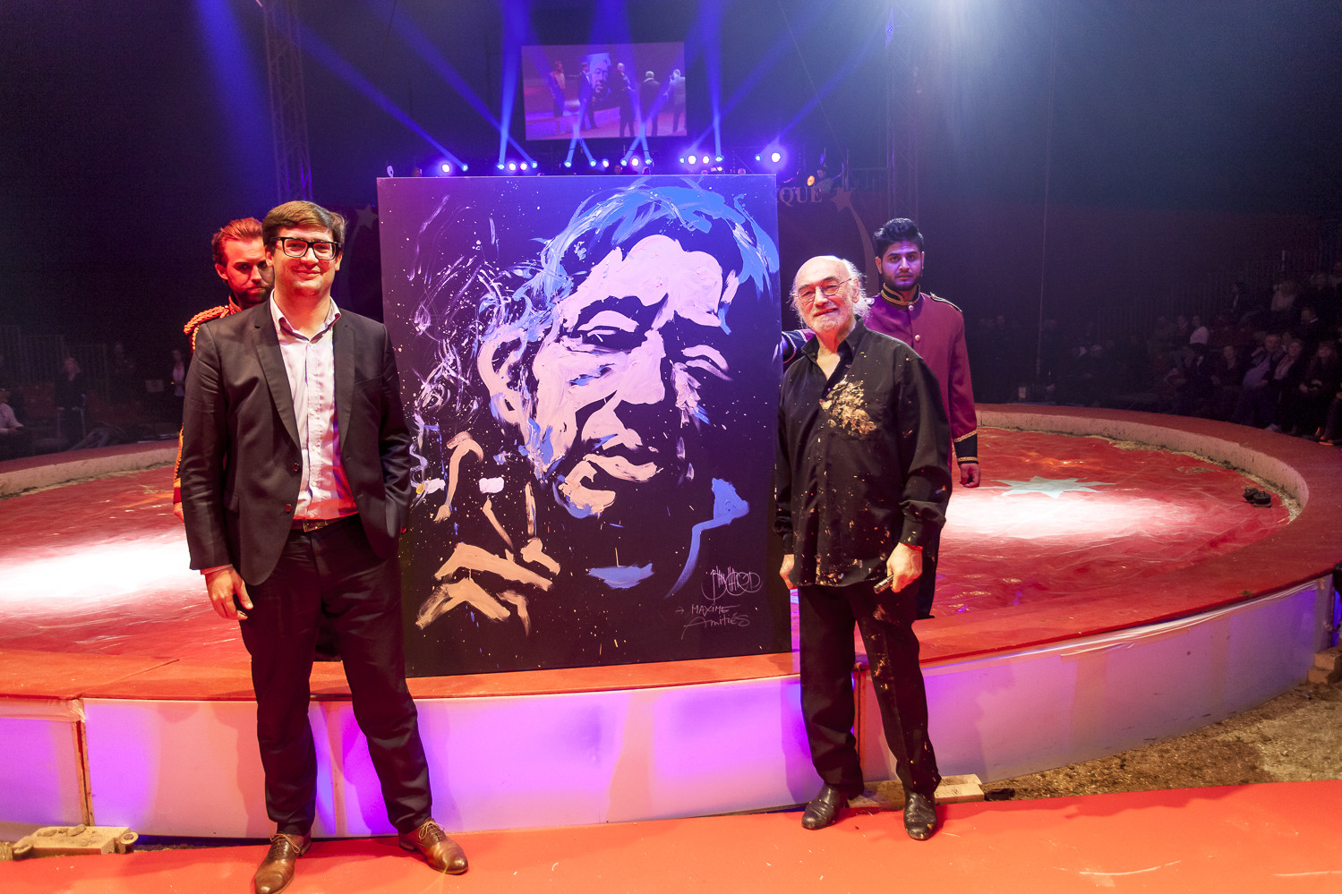 20h45 : Laurent LUYAT annonce la vente aux enchères qui aura lieu en soirée pour les 3 tableaux de Jean-Pierre BLANCHARD avec Steve and Jones (clowns) et Jean Bernard ANGLADE (saxophone)
