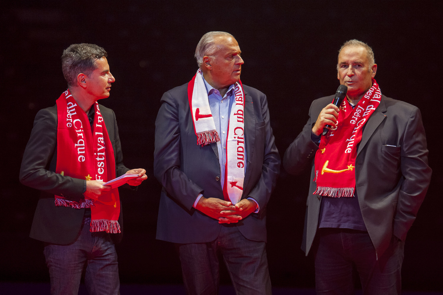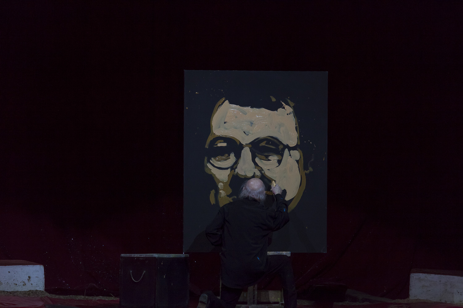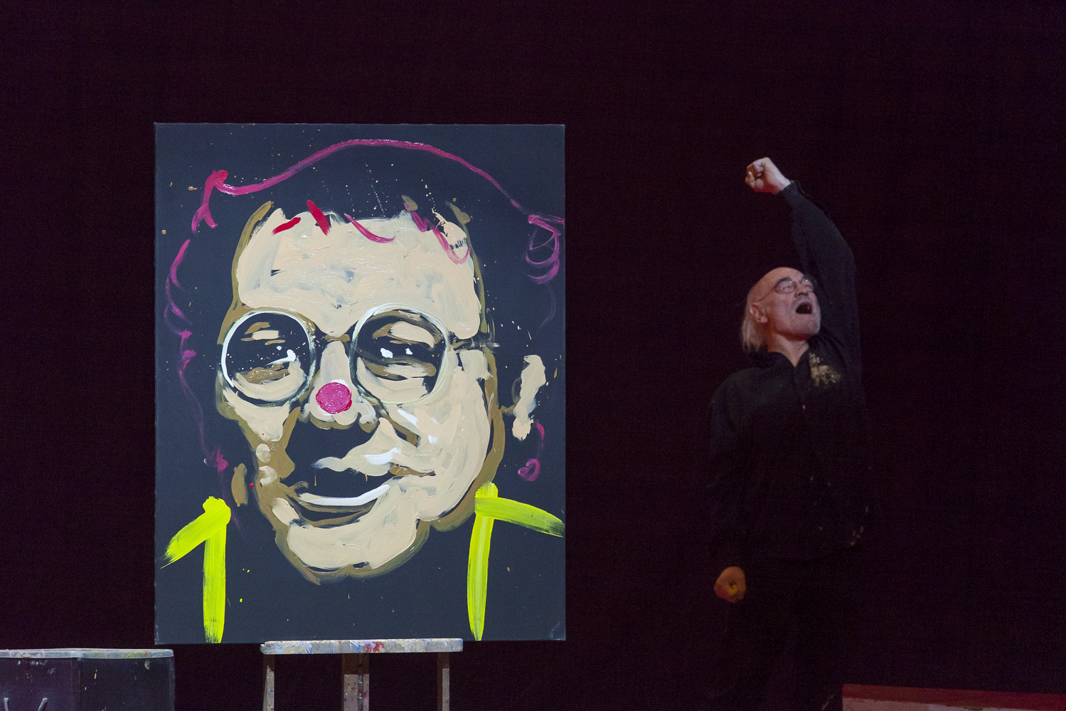 20h45 : Laurent LUYAT annonce la vente aux enchères qui aura lieu en soirée pour les 3 tableaux de Jean-Pierre BLANCHARD avec Steve and Jones (clowns) et Jean Bernard ANGLADE (saxophone)