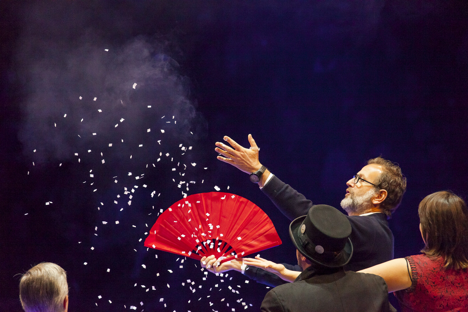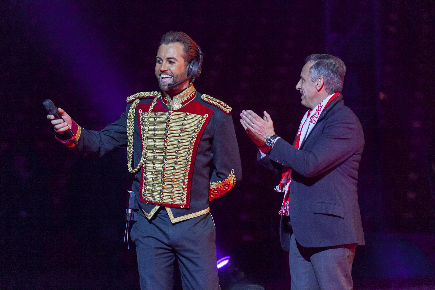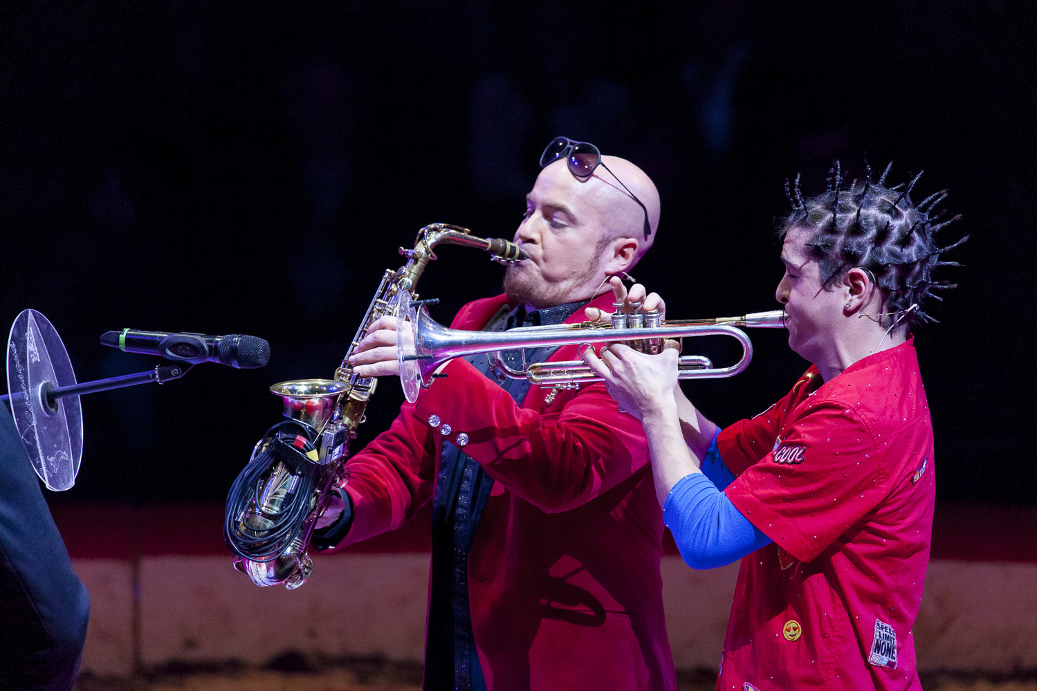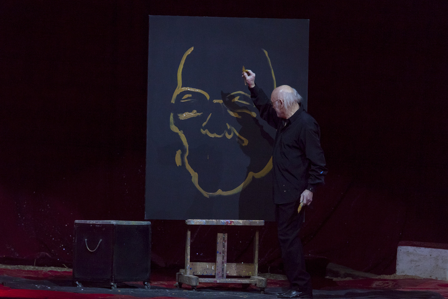 20h45 : Laurent LUYAT annonce la vente aux enchères qui aura lieu en soirée pour les 3 tableaux de Jean-Pierre BLANCHARD avec Steve and Jones (clowns) et Jean Bernard ANGLADE (saxophone)