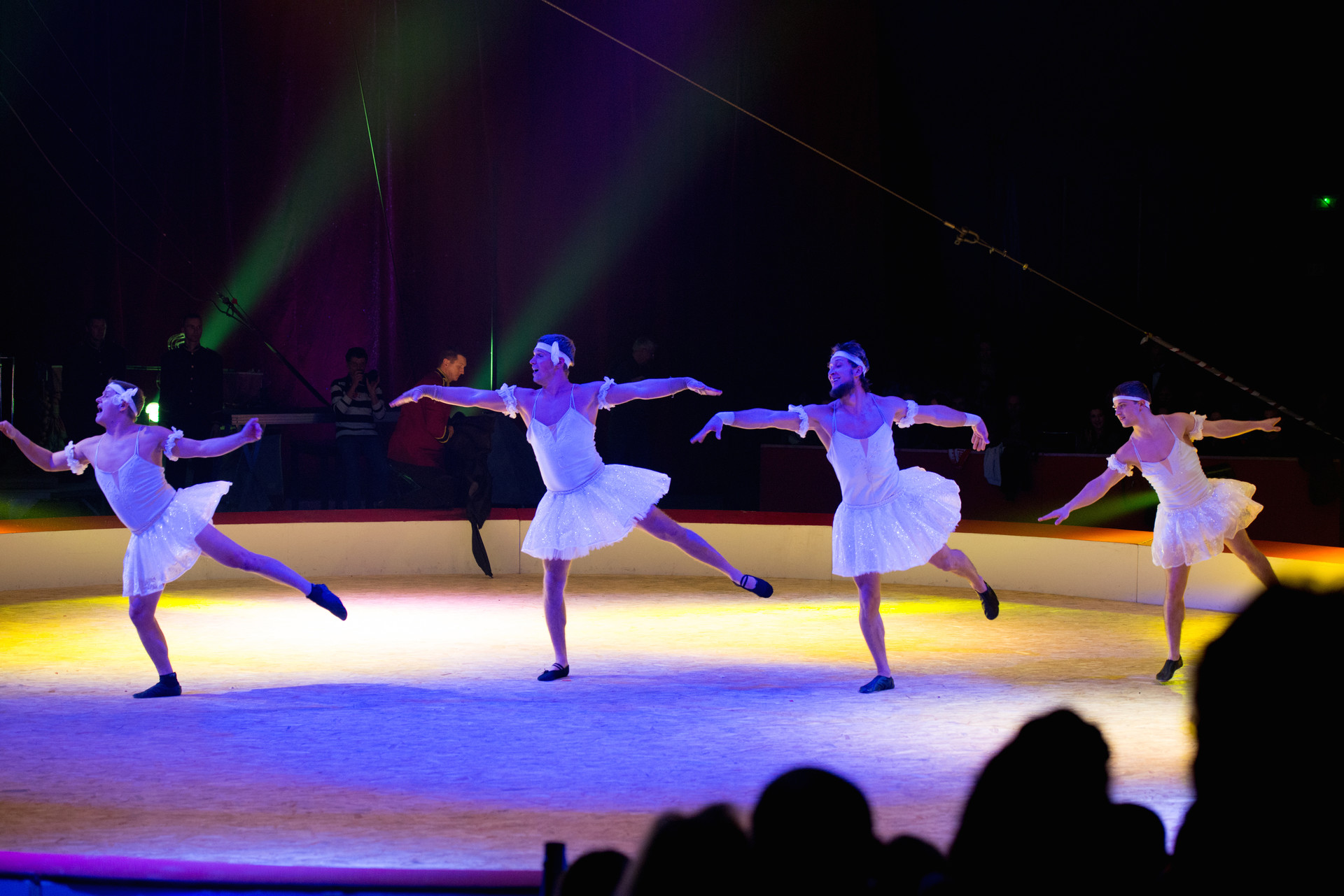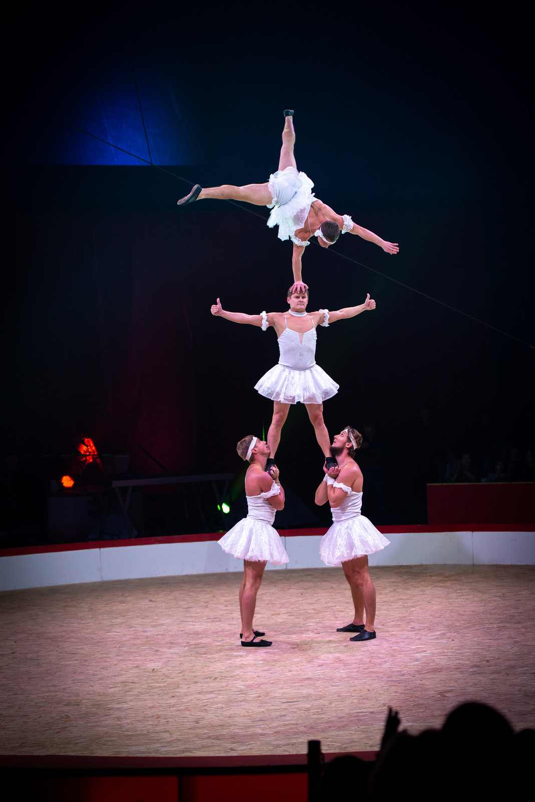 On appelle banquine la plateforme formée par les bras croisés des porteurs pour lancer le sauts périlleux de leurs camarades voltigeurs. Yevgen, Vyacheslav, Danylo et Oleksander sont des gymnastes accomplis. le dernier a même été médaillé d'argent aux championnats d'Europe Junior en 2009 avec l'équipe d'Ukraine. Leurs acrobaties comiques rappellent nos Branquignols d'autrefois ou les clips délirants des Monty Pyhthons.