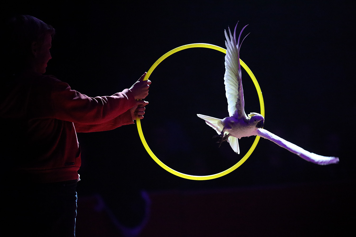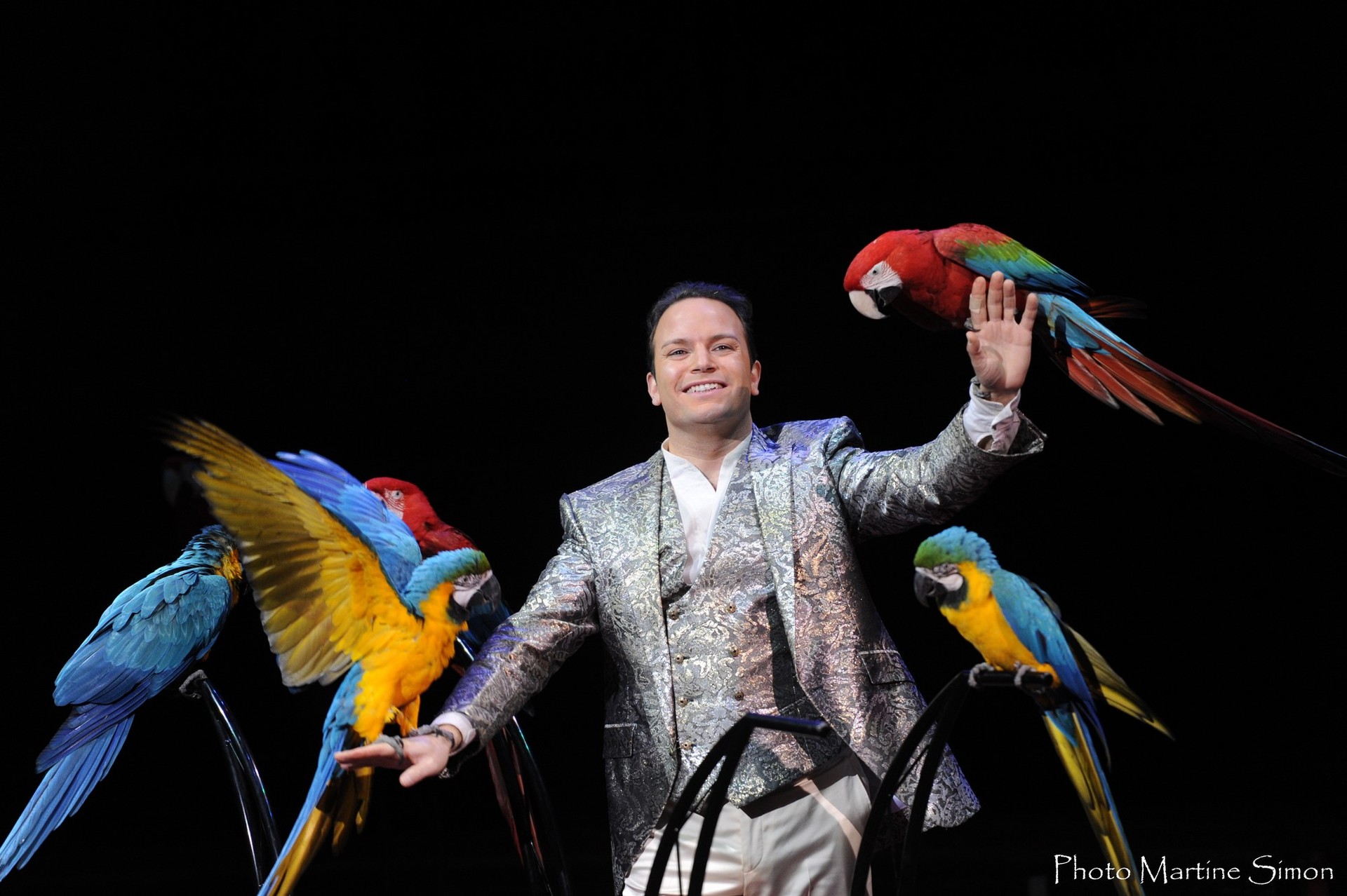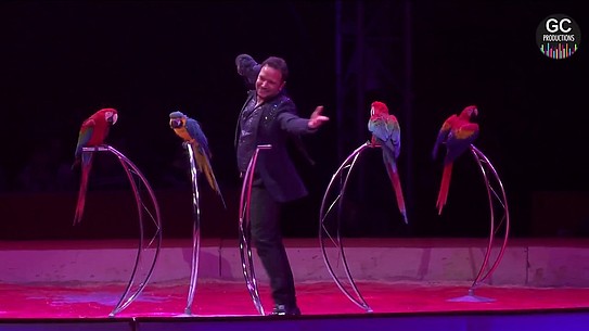 Alessio est né dans la campagne italienne en 1977. Il a passé son enfance au milieu de toutes sortes d’animaux. À quatorze ans, il fut fasciné par le spectacle de perroquets qu’on donnait dans un parc, et trois ans plus tard, il s’engagea dans un cirque pour présenter des otaries et créer un numéro avec des aras. Bien qu’étrangers au monde du cirque, ses parents le laissèrent réaliser son rêve. Alessio a réinventé la manière de présenter les oiseaux : ses aras Ararauna (bleus) et Chloroptères (bleu et rouges) volent dans de grands espaces. Il invite aussi des enfants à partager les évolutions de ses petits conures soleil. Il termine avec son phénomène : Tortuga, un cacatoès amazone à front jaune, avec qui il tient la conversation. Lors d’une tournée en Suisse, la très exigeante Protection Suisse des Animaux a déclaré que ses installations dépassaient amplement les exigences légales minimales dans un pays pourtant pointilleux dans ce domaine. Quant au numéro, elle l’a jugé exemplaire et sans problèmes, alors admirez sans retenue ces merveilleux artistes aériens !
