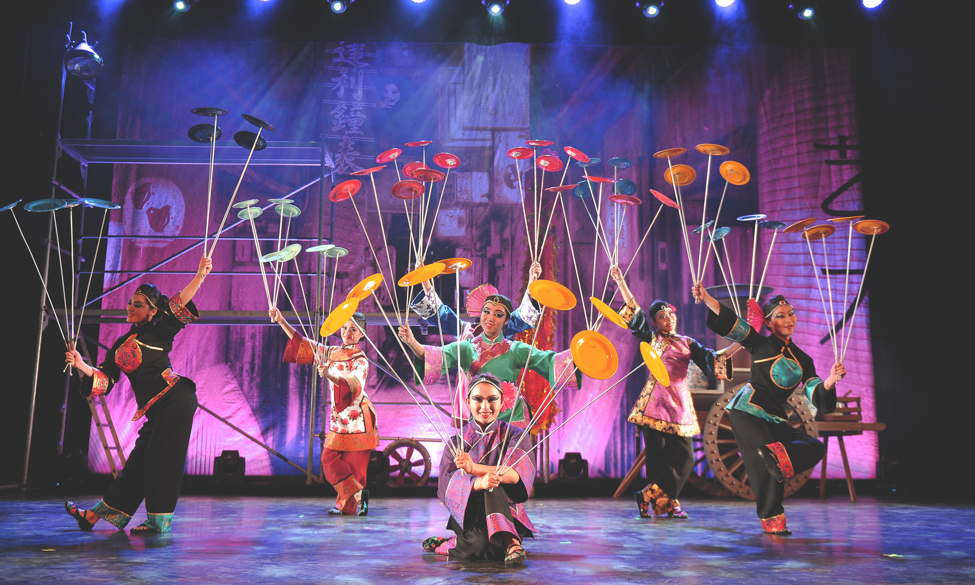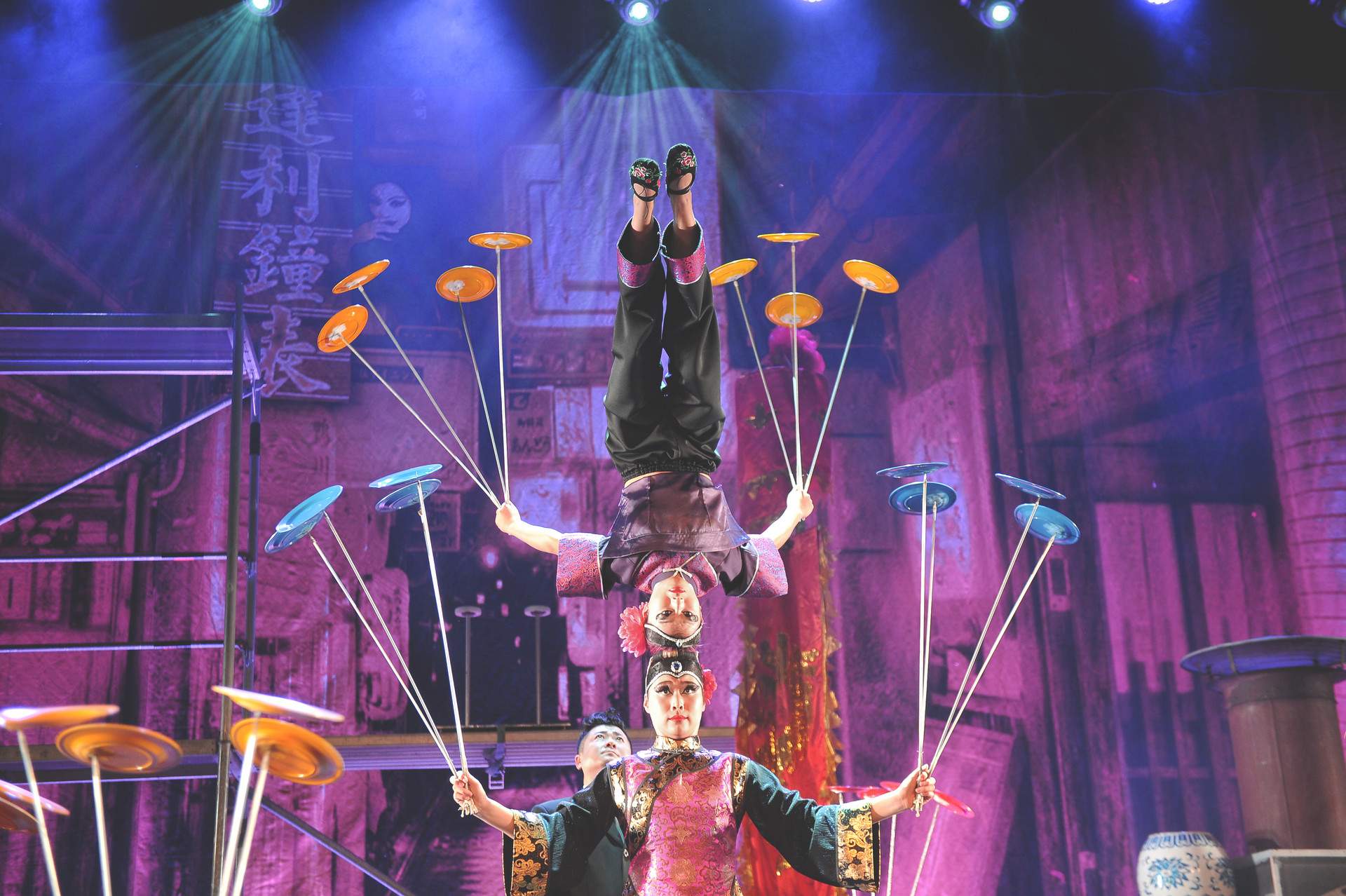 Le Cirque National de Chine a été fondé en 1953 par Zhou Enlai, le premier ministre de l’époque, qui souhaitait rassembler dans une même troupe le meilleur de l’acrobatie chinoise. Ses artistes ont été recrutés à travers le pays dans la multitude de troupes qui se sont constituées dans les villes et les provinces. Il réunit suffisamment d’exécutants pour envoyer à travers le monde plusieurs ensembles qui triomphent dans les festivals internationaux. Les spécialités qu’il propose ce soir illustrent merveilleusement comment les acrobates chinois utilisent des objets domestiques pour réussir leurs exploits, comme les assiettes au bout d’un bambou, spécialité dont on retrouve la trace sculptée sur des sépultures de la dynastie Han (206-226 A.C). D’abord exécutée avec une seule assiette, cette discipline s’est compliquée en multipliant les assiettes et en échafaudant d’impressionnantes pyramides.
