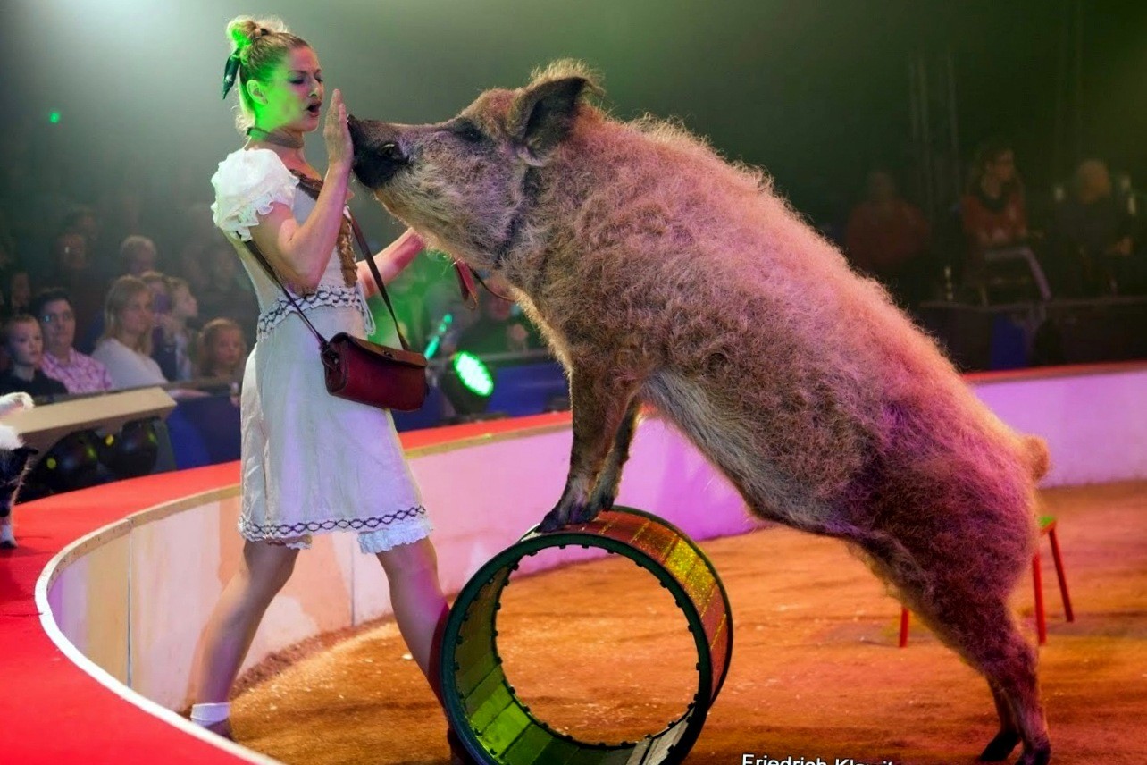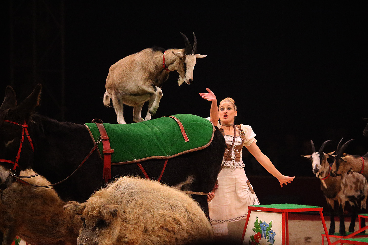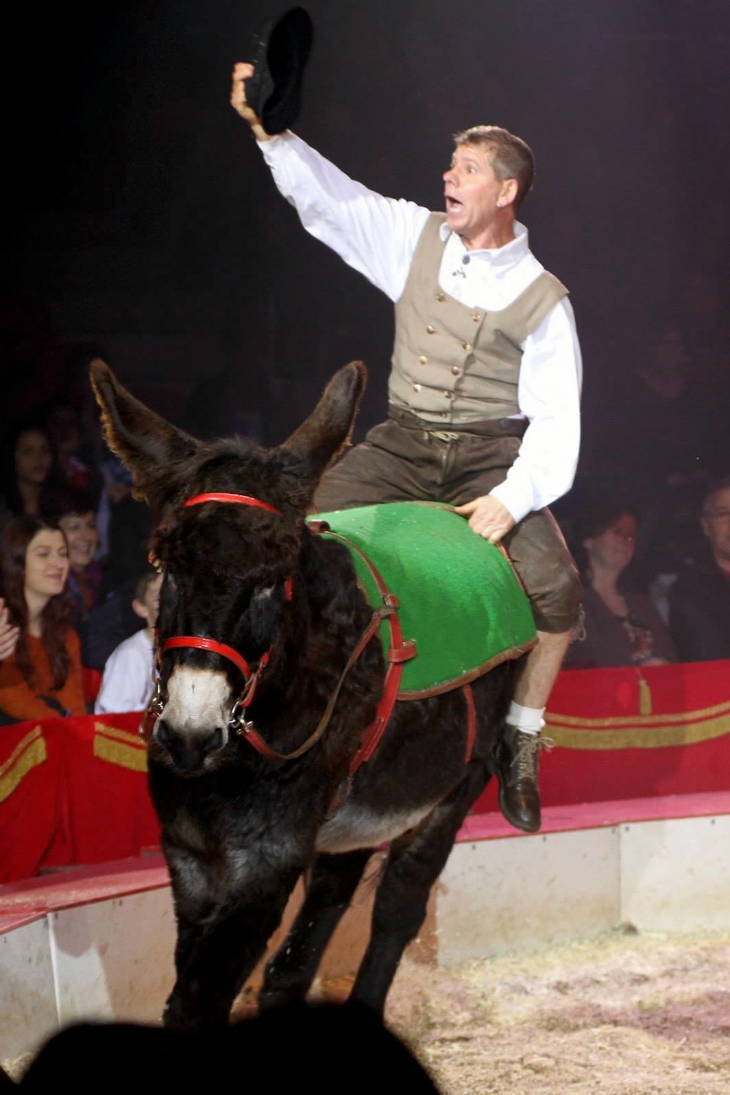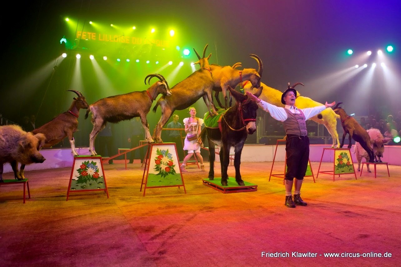 Les journées sont longues pour ce couple d’artistes passionnés d’animaux qui, en plus de leurs singes, élèvent toutes les espèces d’animaux qu’on voit dans une ferme : vaches, ânes, chèvres, cochons, chiens et le coq qui vient se placer au sommet d’une pyramide inspirée par les Musiciens de Brême, le célèbre conte des frères Grimm. Ce numéro est un livre d’images vivant où la complicité n’existe pas seulement sur la piste, mais dans les coulisses. Aimer les animaux n’est rien de le dire, il faut le prouver tous les jours quelque soit le temps et l’humeur des maîtres et de leurs protégés.