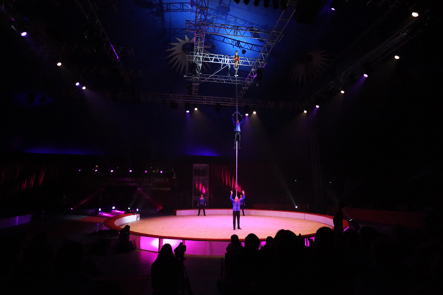 Ils nous viennent de Russie, de la Compagnie du Cirque d'Etat de Moscou "ROSGOCIRK". Leur chef, Talaybek Saralaev, appartient à une famille de cirque. Son maître fut Alexei Sarach, le plus prestigieux technicien et chef de troupe de cette belle discipline qu’est l’équilibre sur perches. C’est Talaybek qui a mis en scène leur nouvelle production « Confrontation ». Au summum du numéro, il lance une perche vers un partenaire qui la rattrape toujours en équilibre avec, au sommet, la belle Irina Saralaev. Il y a, certes, des longes qui protègent les voltigeurs – et les spectateurs ! − mais elles ne dispensent pas de tenir les délicats équilibres.