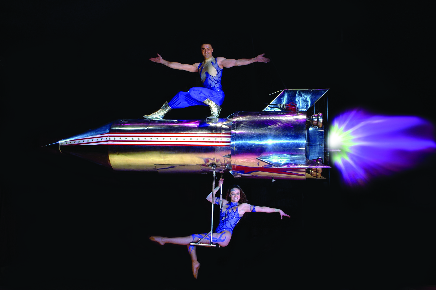 Au cirque, tout est possible. On y a montré les grandes batailles napoléoniennes, la course de chars de Ben Hur... Ce soir, c’est une évocation de la conquête de l’espace que nous présentent Pablo Garcia et son épouse Vicky. Leur fusée décolle doucement avant de se lancer dans une suite de révolutions à vitesse croissante. Ils se suspendent dans le vide sans aucune protection et doivent résister à une force de plusieurs G qui les pousse vers l’extérieur. Ils osent des lâchers extrêmes par un bras, un pied ou suspendus à la barre d’un petit trapèze. Le cirque, c’est un mélange subtil où l’esthétique se teinte parfois d’émotions mais où le risque est toujours calculé parce qu’il est quotidien. Vicky appartient à une des plus anciennes dynasties du cirque, les Fossett, et Pablo vient d’une famille qui trouve ses origines en Irlande et en Espagne.