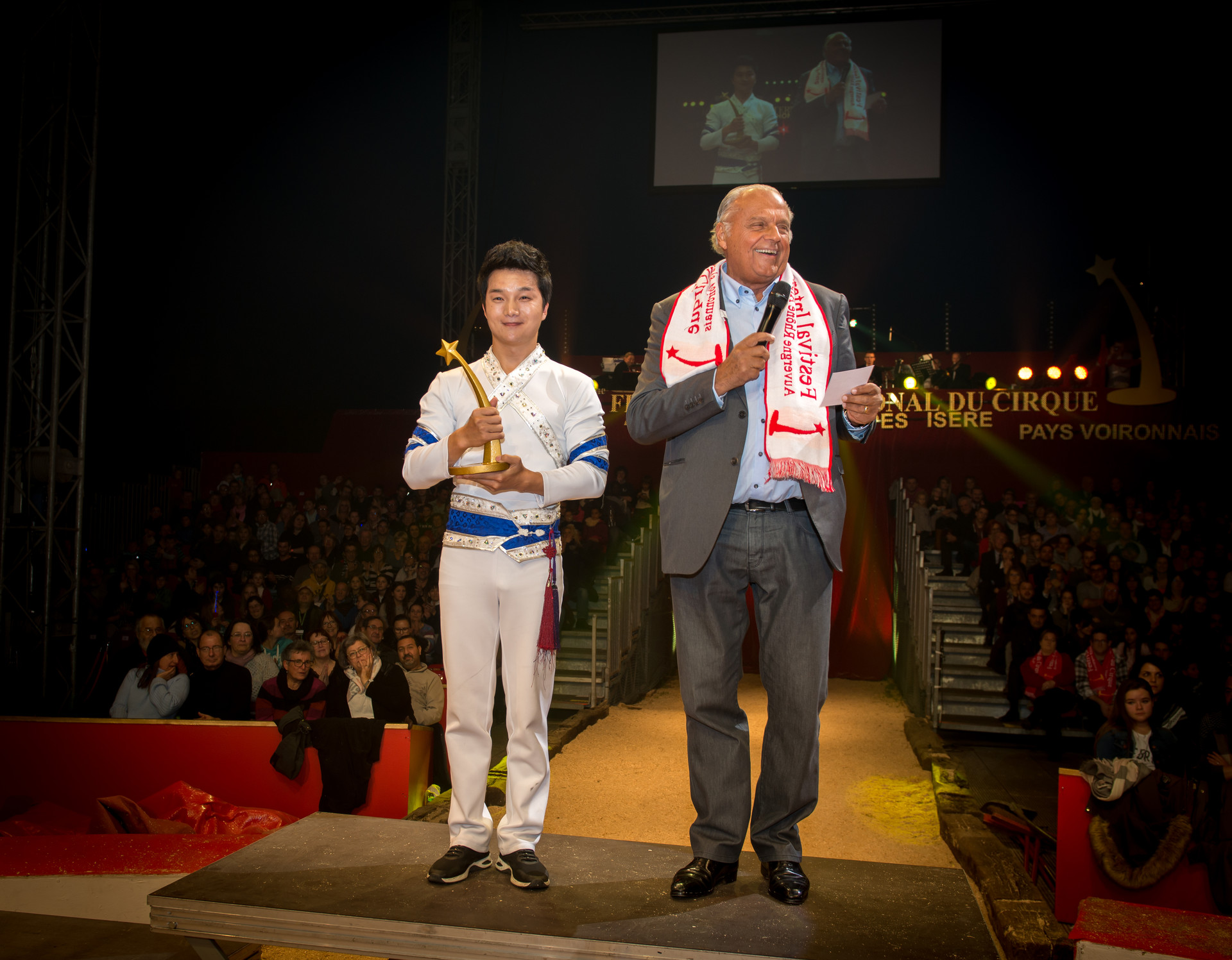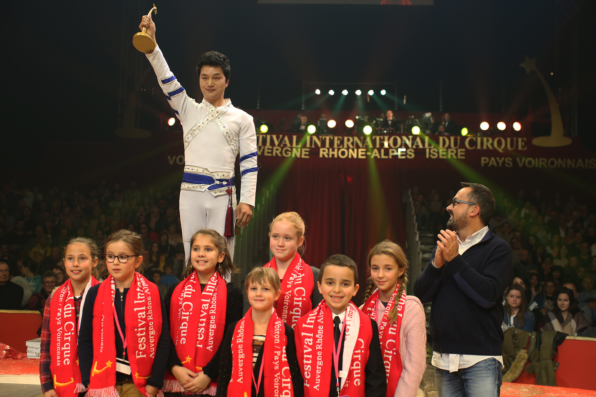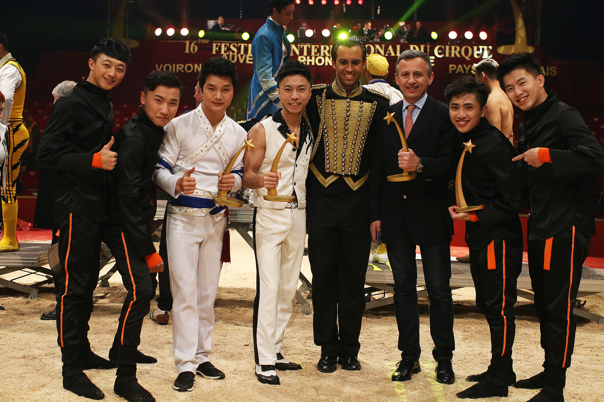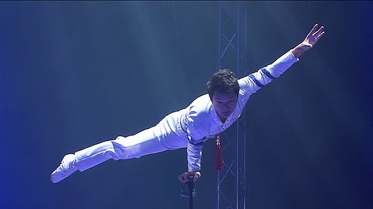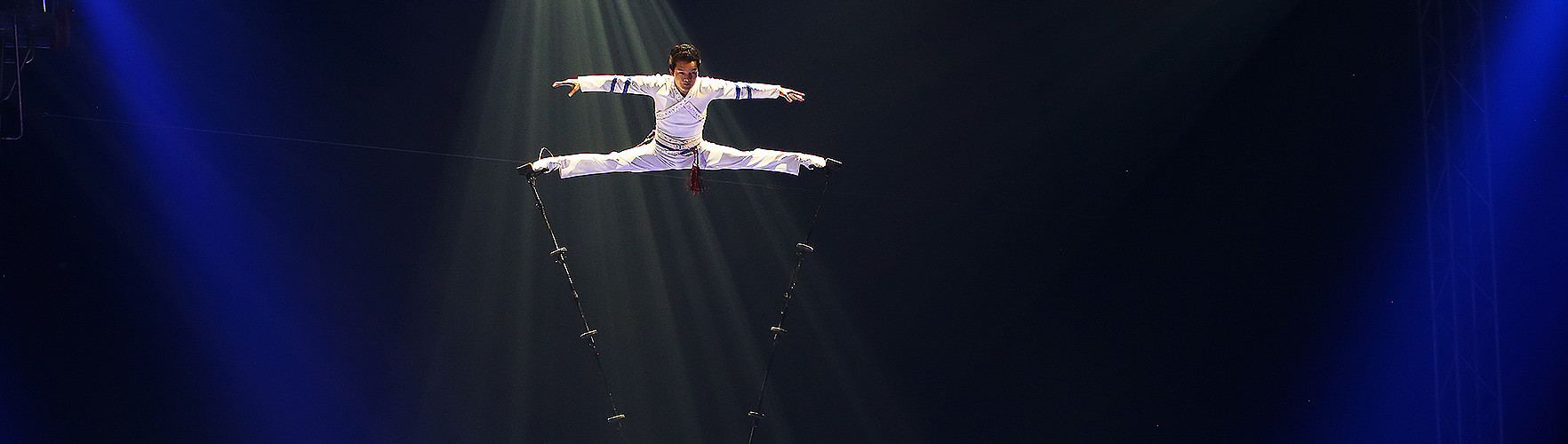 Il faut remonter très loin dans l’histoire de la Chine pour trouver trace des premiers équilibristes. Leurs postures avaient alors un caractère sacré, puis la discipline se développa, deux siècles avant J.C. sous la dynastie des Han. En 108 avant J.C., l’empereur Wu Di invita les dignitaires du pays et les souverains voisins à un événement appelé « Les Cent Divertissements » qui est sans doute le premier festival de cirque de l’histoire. Il y avait, bien sûr, des équilibristes. Deux mille ans plus tard, les festivals se sont multipliés et c’est un autre Chinois que nous accueillons aujourd’hui en la personne de Shuang Jian avec une forme nouvelle d’exercices : en équilibre sur un bras, il emmanche l’un après l’autre des tubes pour constituer deux hautes perches où il se tient les bras tendus en croix ou en grand écart tout en se balançant dangereusement !