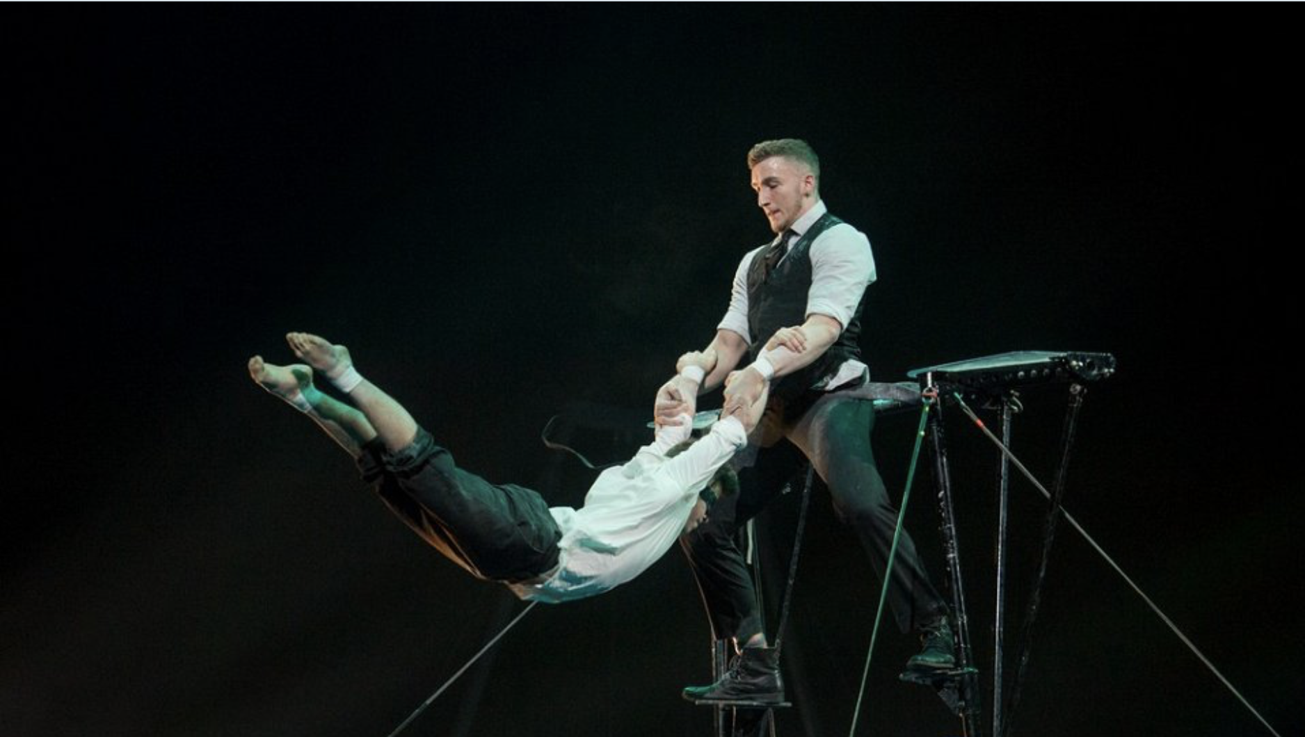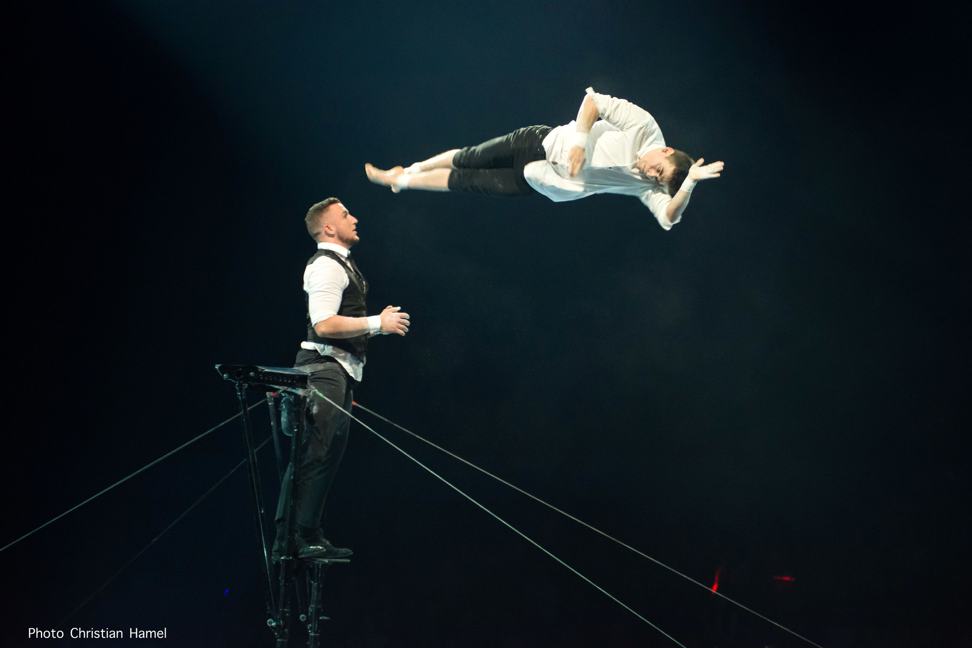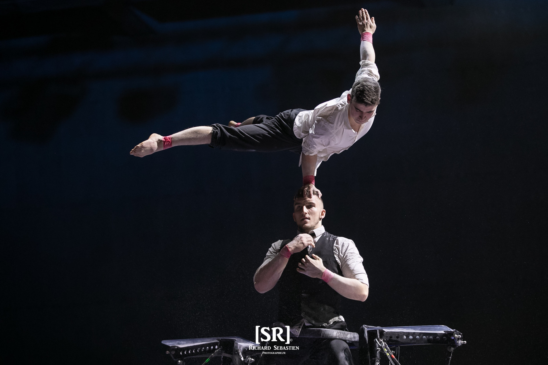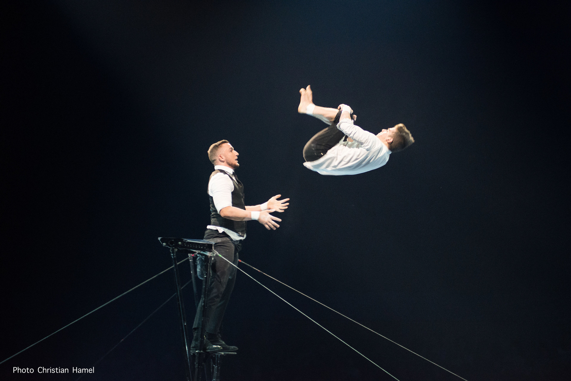 Le cadre russe est une spécialité créée dans les années cinquante par Semen Arnautov : debout sur un portique, retenu par un ceinture, un porteur lance et rattrape son partenaire. C’est sur cet agrès que s’expriment Maxime Blanckaert, le porteur, et Nathan Briscoe un voltigeur qui pèse quand même 65 kilos! Ils exécutent, entre autres, un double salto avant (qu’on appelle casse-cou au cirque) et des sauts-périlleux compliqués de pirouettes.