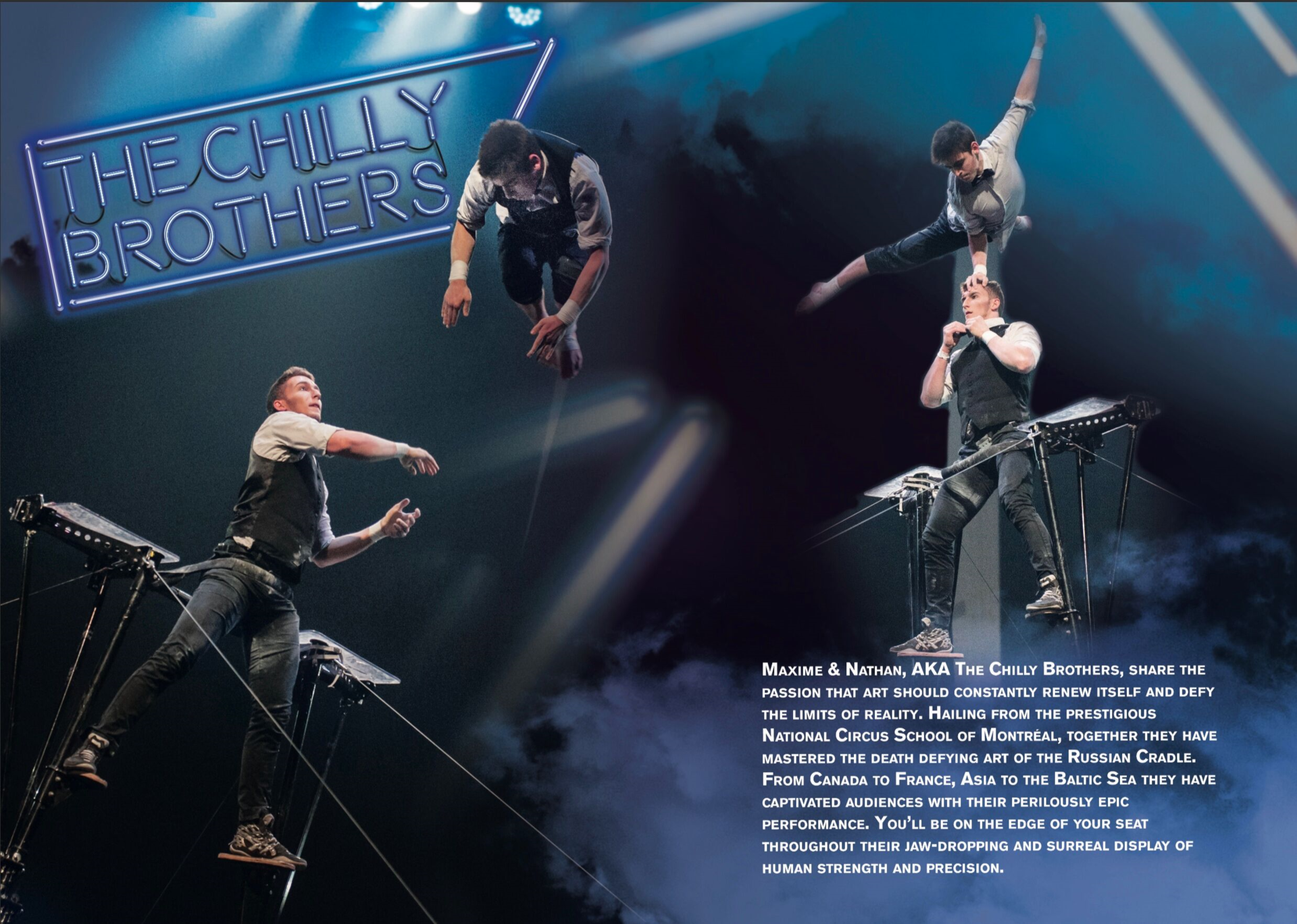 Nathan est entré à douze ans à cette même école pour suivre un programme de Préparation à la Formation Supérieure (PFS) avant de s’orienter vers la gymnastique et le main-à- main. Sa rencontre avec Maxime a donné naissance au numéro des Chilly Brothers. Leur professeur, Ilya Baranov, fut un des meilleurs athlètes russes de gymnastique artistique avant de travailler au Cirque du Soleil.