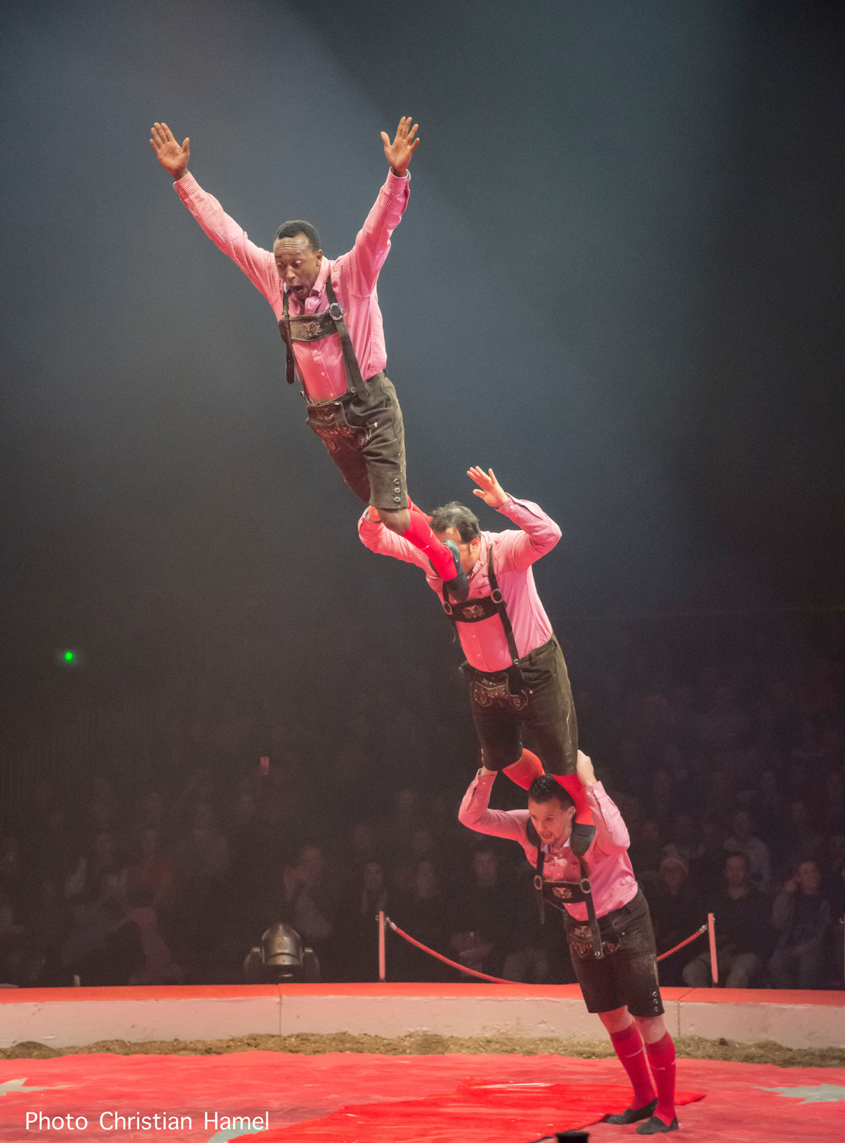 Un tapis et une table : voilà le seul matériel nécessaire à ce numéro. Le reste, ce sont ces trois garçons qui l’assurent avec leurs incroyables cascades comiques : sauts périlleux, chutes et, même, des claques soigneusement administrées. La cascade est une discipline fondamentale de l’acrobatie qui n’a rien à voir avec les prouesses des cascadeurs de cinéma. Le terme cascade vient de l’italien cascare qui veut dire tomber et ce sont les chutes comiques qui font le sel de ce numéro.