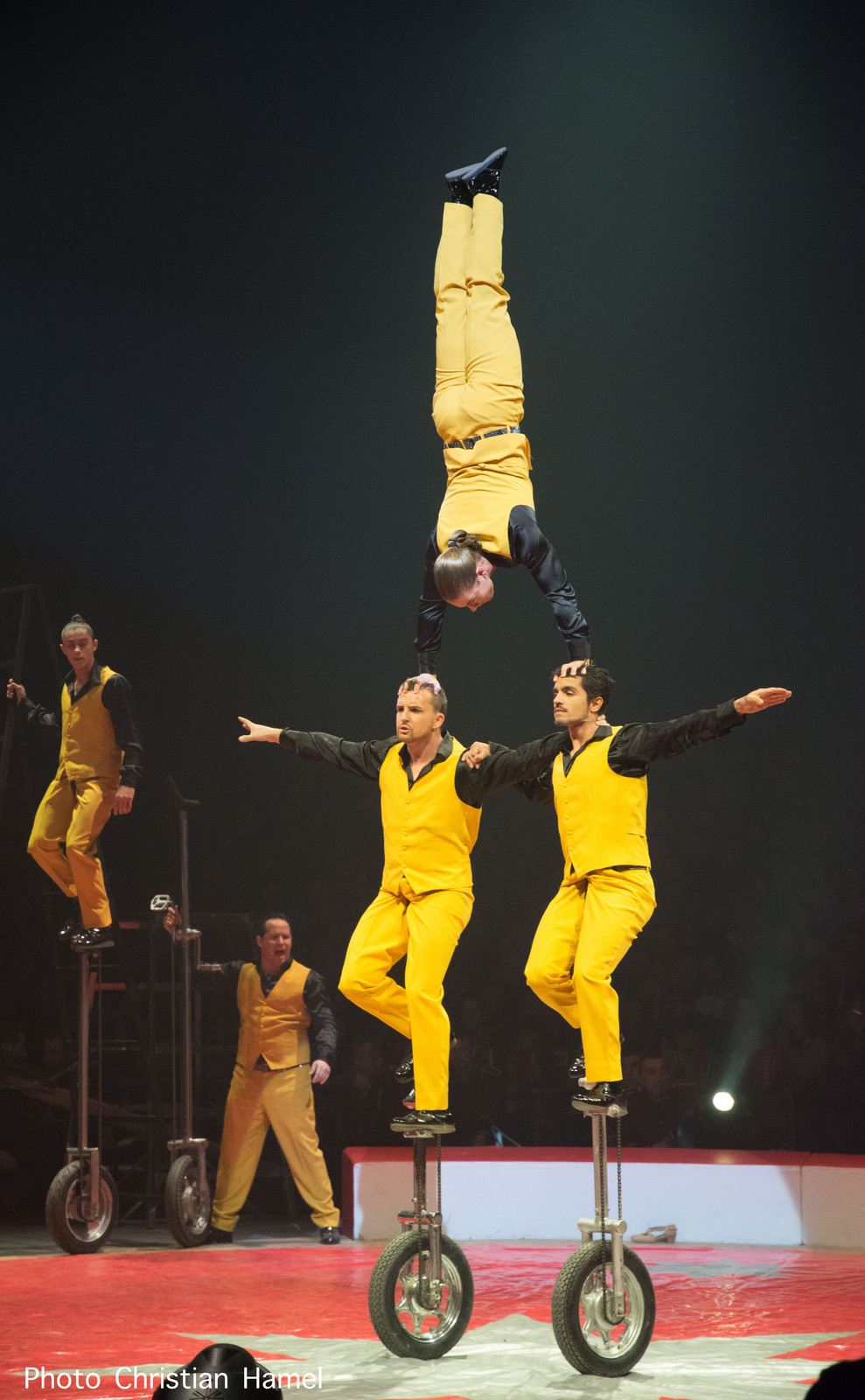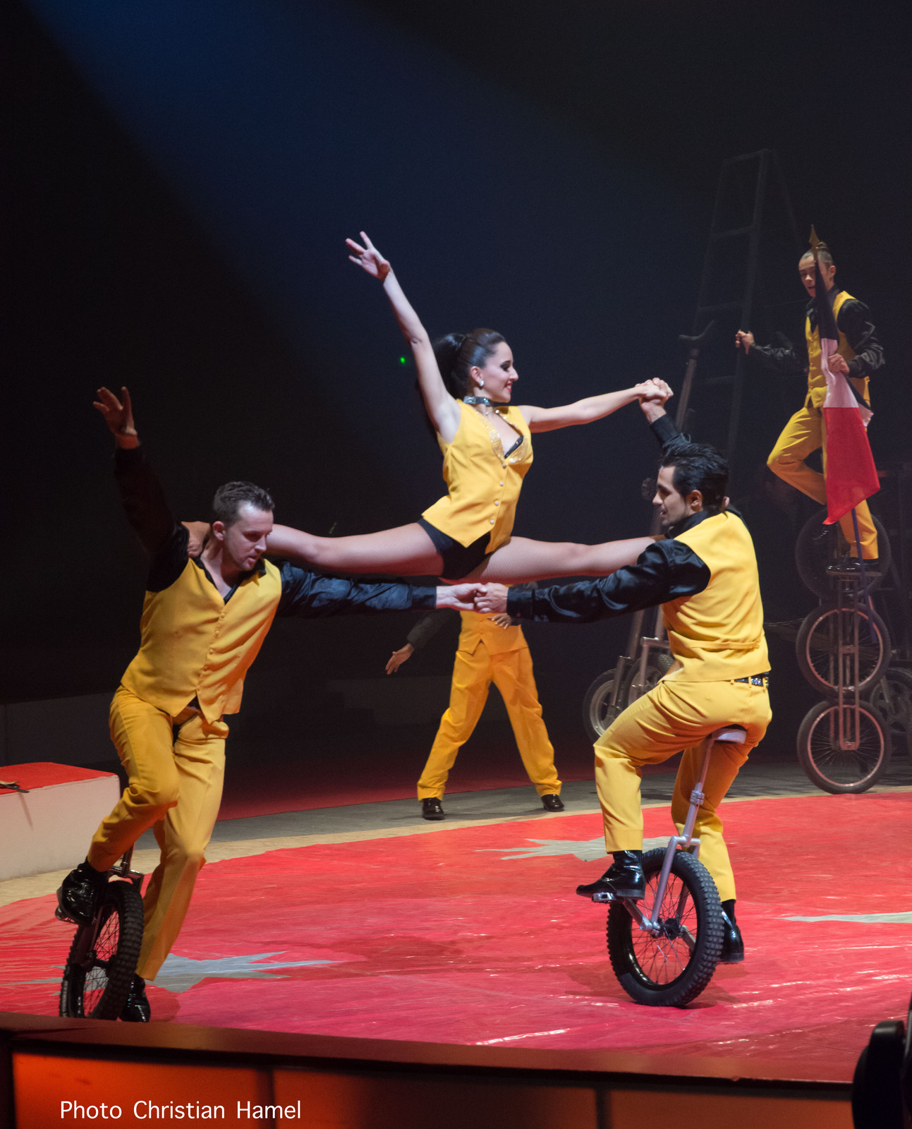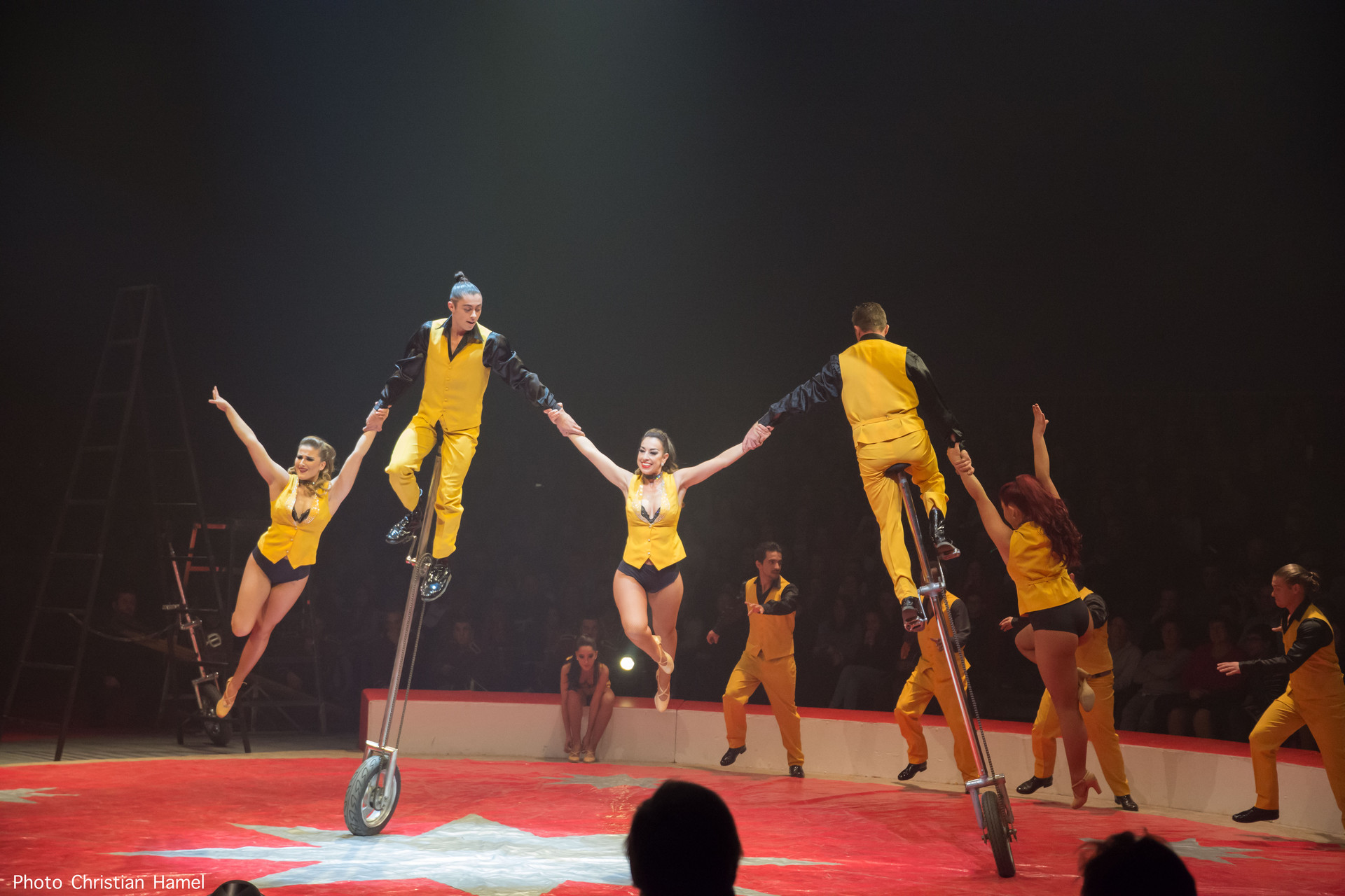 Cette troupe illustre merveilleusement ce qui est l’essence du cirque : la famille. Ici elles sont deux, celle des Macaggi, originaire d’Italie mais qui, depuis de longues années, tourne en Espagne et celle des Valla Bertini, originaire de République Tchèque. Les Macaggi sont, avant tout des acrobates, ils ont créé des numéros qui restent, encore aujourd’hui, parmi les plus forts. Tous les jours, par tous les temps, la famille continue à s’entraîner, sous les yeux du patriarche, Lucetto : on s’exerce au fil, au jonglage, au trapèze et au monocycle, spécialité que les Valla Bertini ont amené à l’occasion de tournées chez les Macaggi. Il n’y a pas d’école de cirque en République Tchèque et pourtant ils restent les meilleurs dans beaucoup de disciplines comme celle des acrobaties à vélo. Emmenés par Pavel, ils reprennent un exercice unique qui a fait la réputation des Valla Bertini jusqu’à Las Vegas : le saut périlleux lancé à la bascule et reçu sur les épaules d’un porteur en équilibre sur un monocycle. Qui dit mieux ?