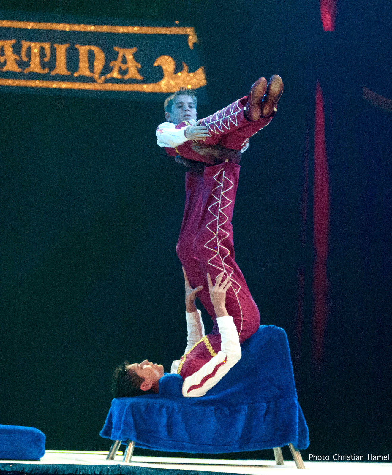 C’est ce qu’ont choisi Ruben et Ivan Dias en apprenant les jeux icariens, spécialité où leur père Angelo et leur oncle Flavio s’étaient distingués. Dans ce numéro, le porteur couché sur le dos sur la trinka, lance et rattrape son partenaire avec ses pieds.