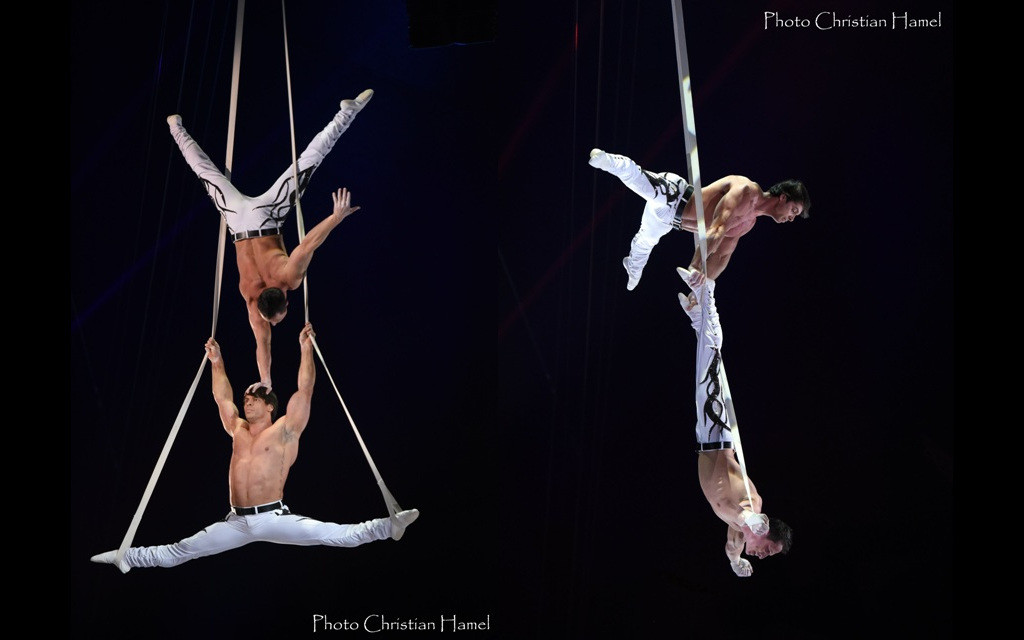 Ils viennent de Berlin où ils étaient au programme du grand spectacle Vivid au Friedrichstadt-Palast. Ils ont mis au point un travail aérien, véritable main à main en altitude, qui met en valeur leurs qualités acrobatiques et témoigne d’une recherche esthétique proche de la statuaire.