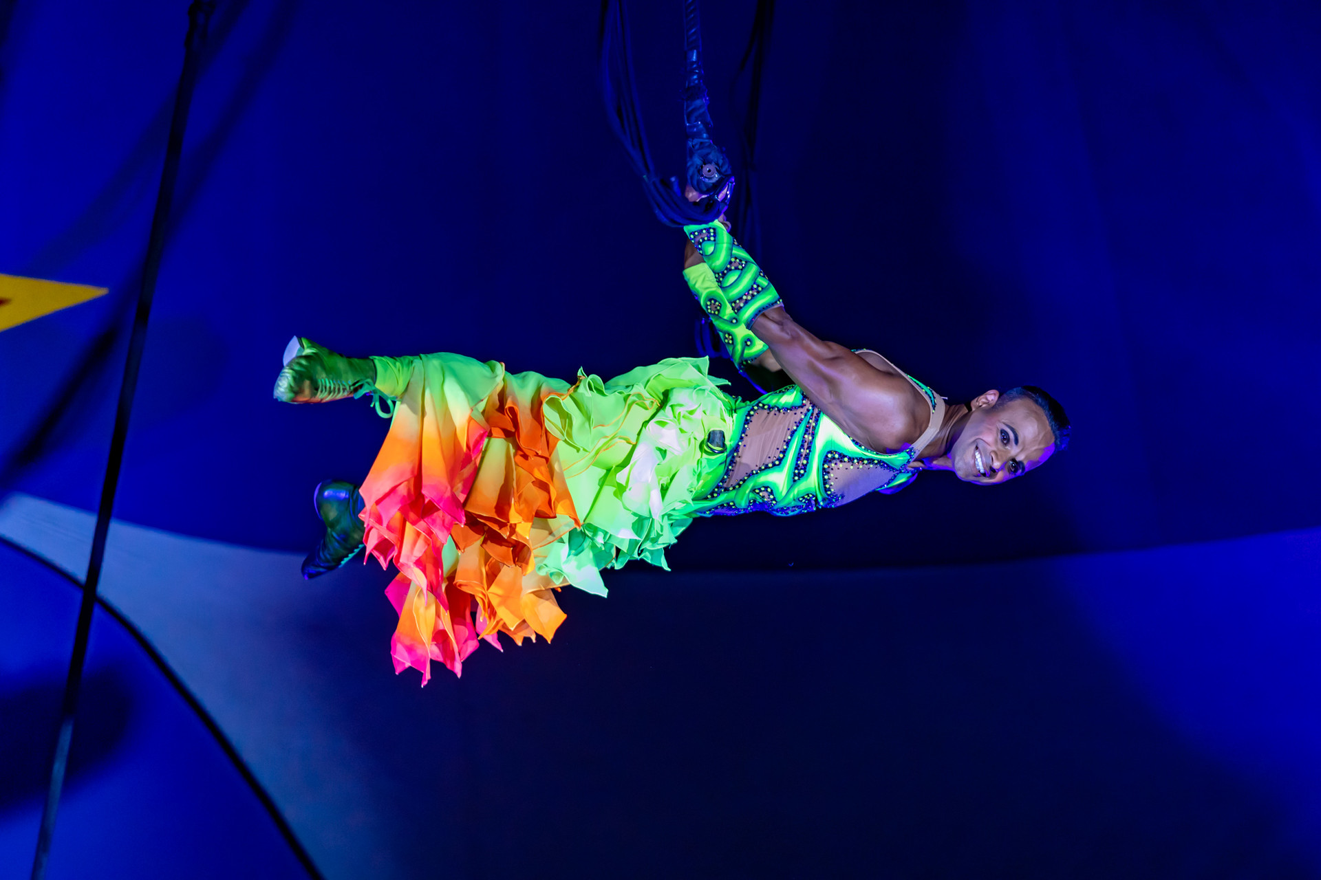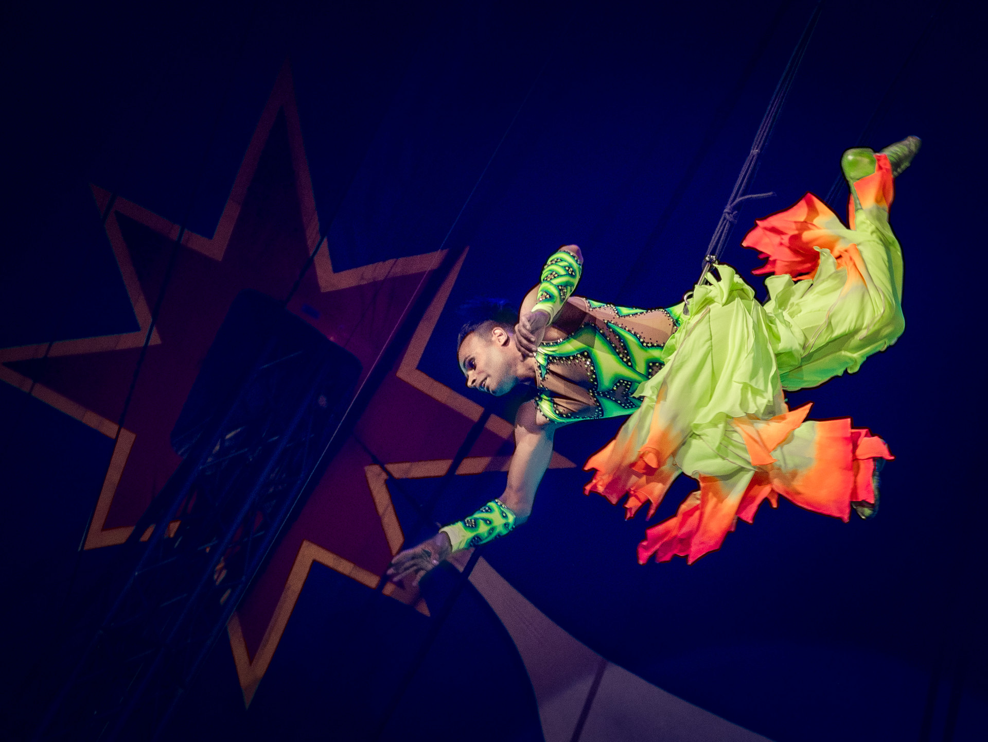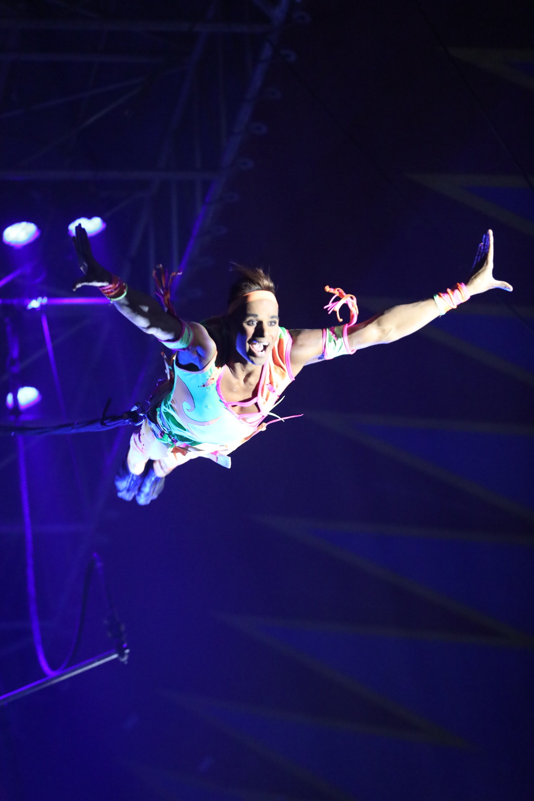 Au trapèze en ballant, il présente un exercice rarement vu sous un chapiteau : un échappement en jarrets de la barre du trapèze qu’il rattrape ensuite par les mains après une demi-pirouette. A ses évolutions plus classiques, il a ajouté un travail avec les sangles élastiques qu’il appelle linorna.