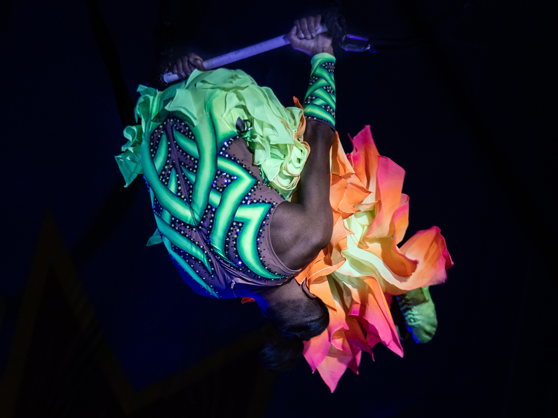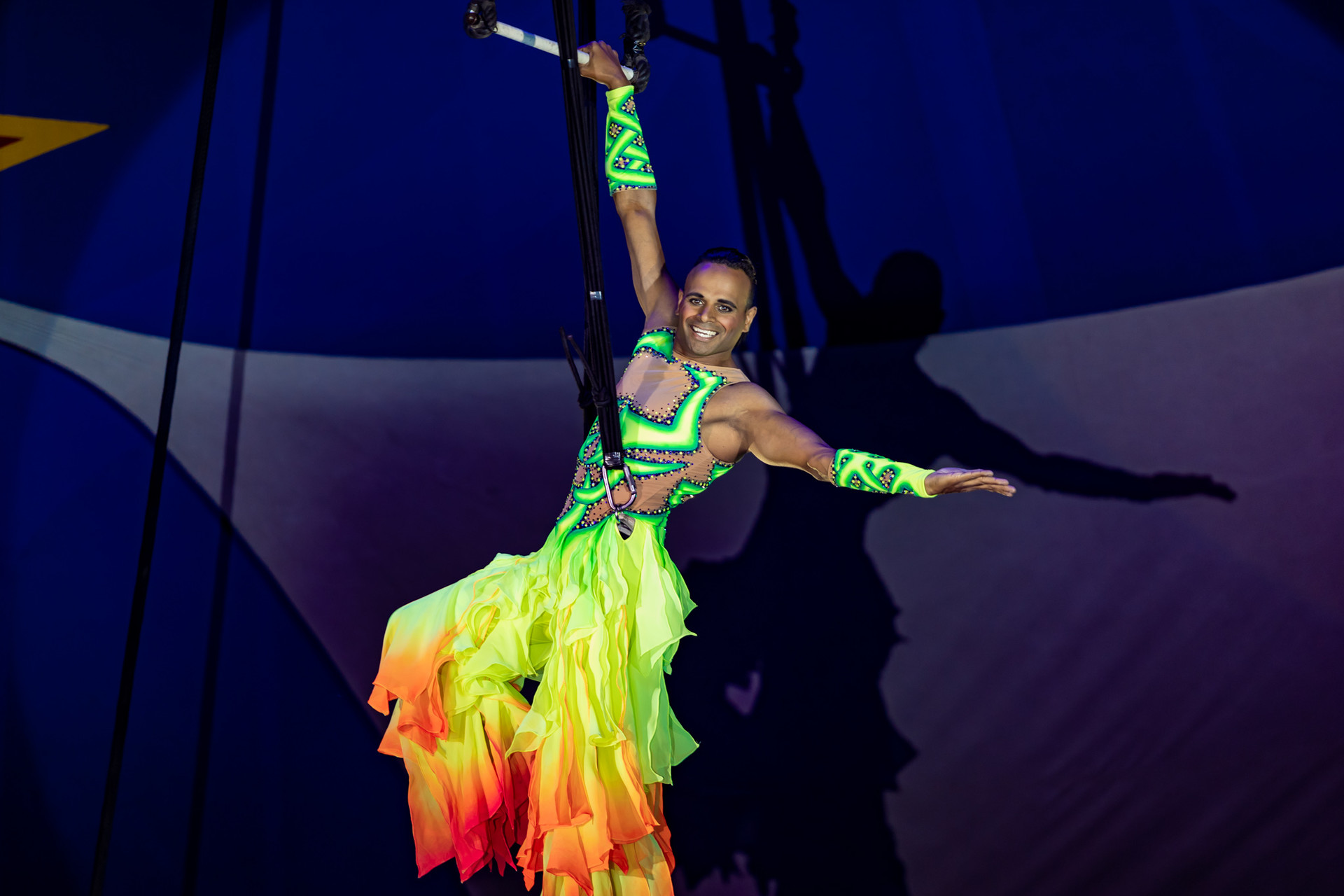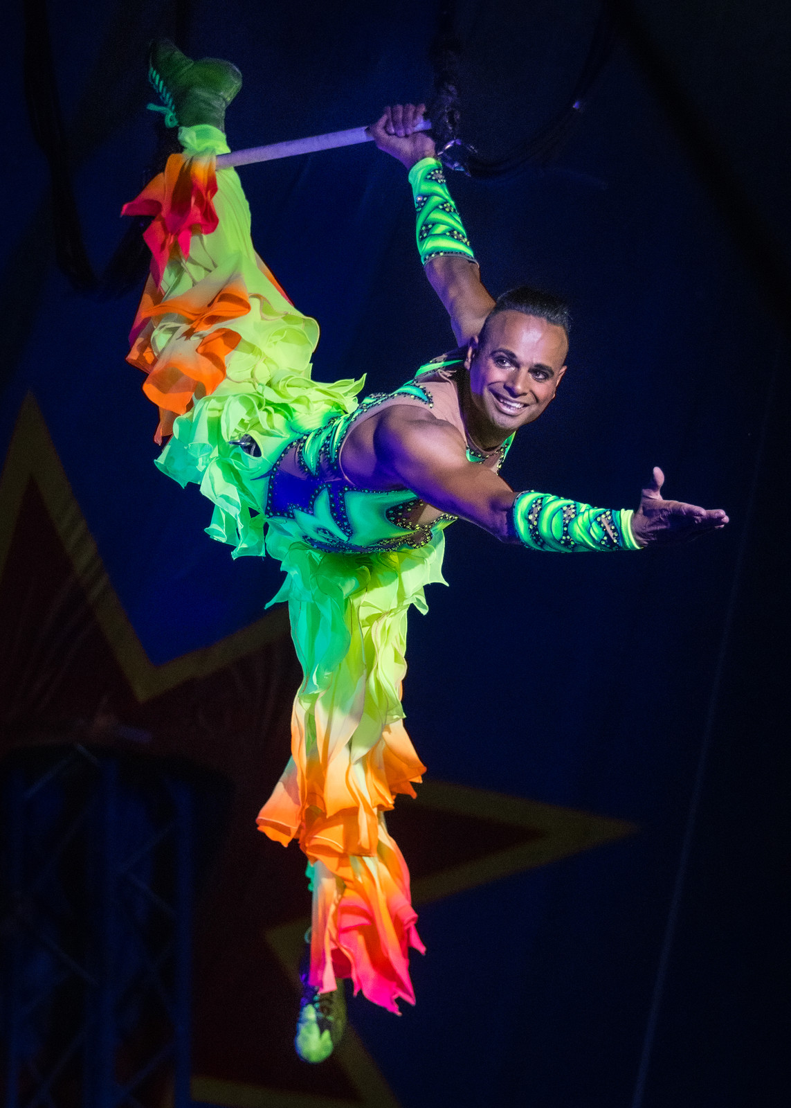 Au trapèze en ballant, il présente un exercice rarement vu sous un chapiteau : un échappement en jarrets de la barre du trapèze qu’il rattrape ensuite par les mains après une demi-pirouette. A ses évolutions plus classiques, il a ajouté un travail avec les sangles élastiques qu’il appelle linorna.