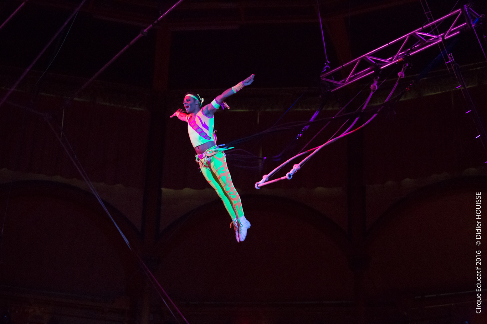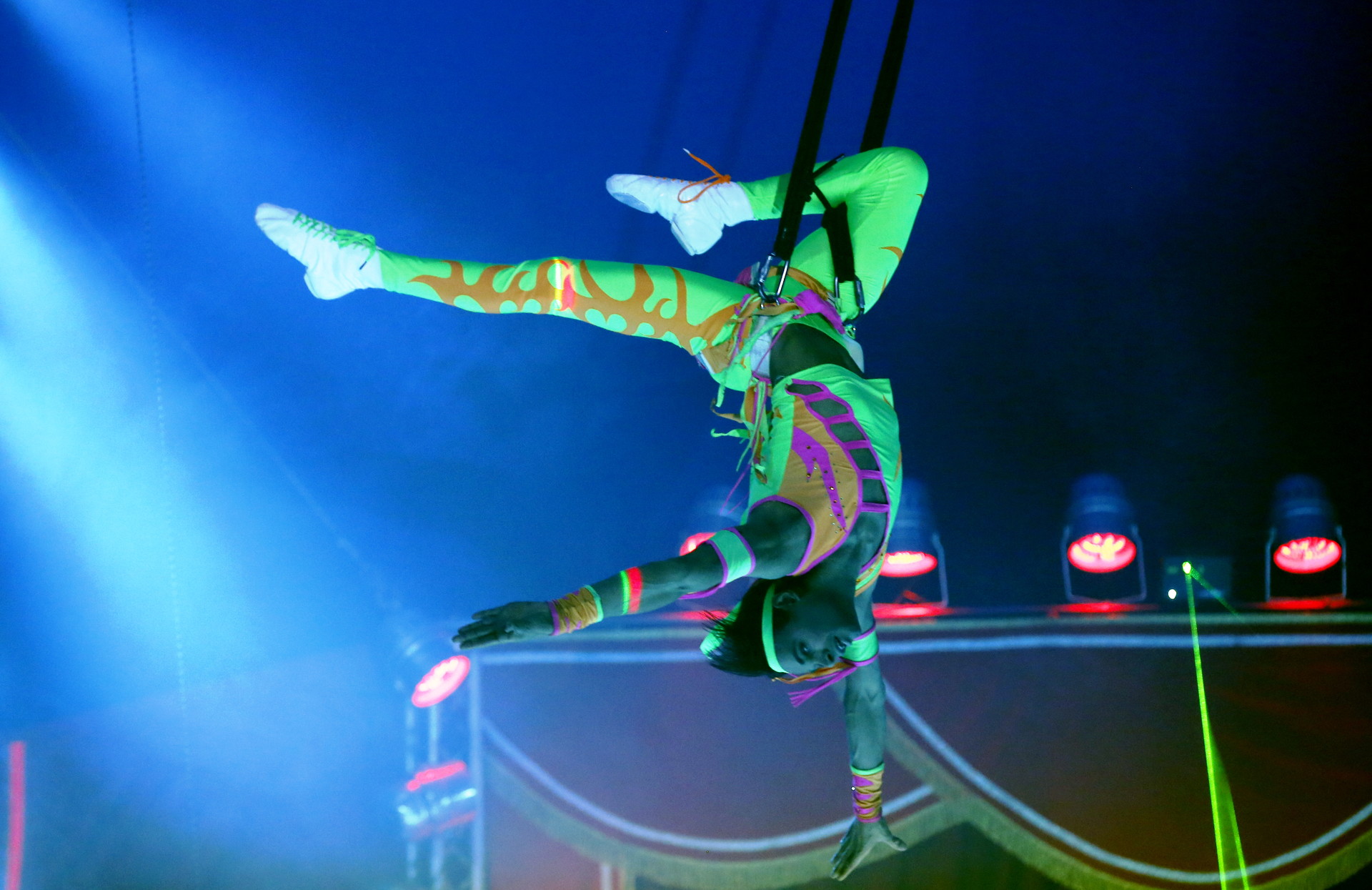 Une prestation plus difficile qu’il n’y parait : s’il est facile de se balancer avec les élastiques, la précision des rattrapes après de sauts multiples périlleux demande beaucoup d’attention !