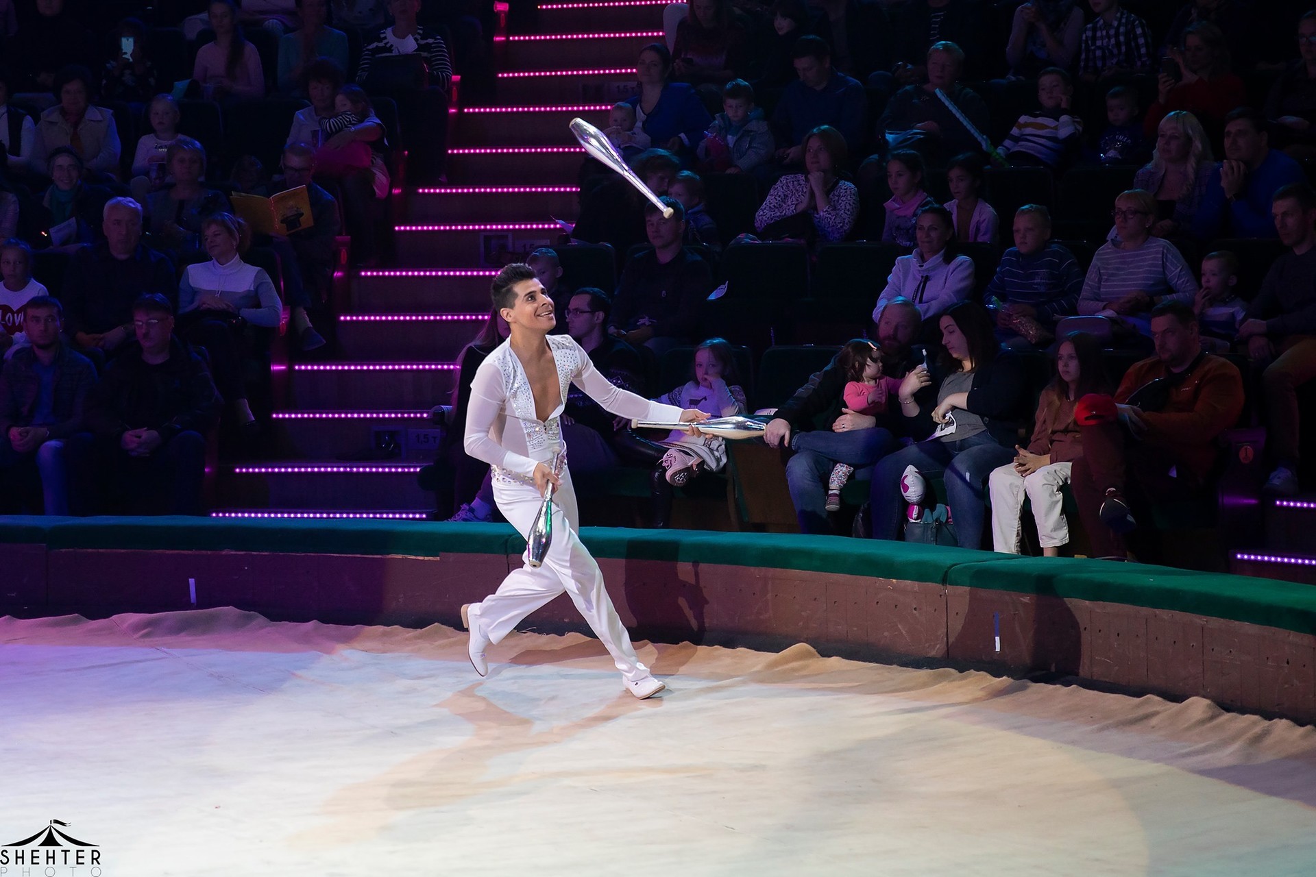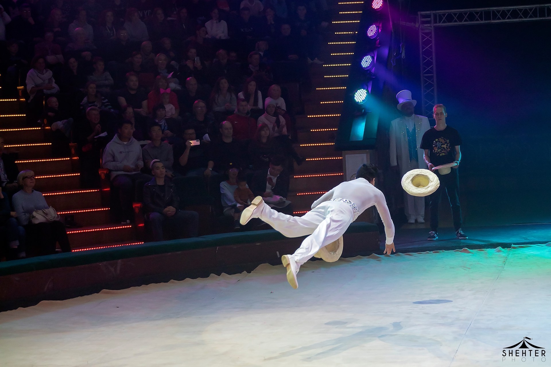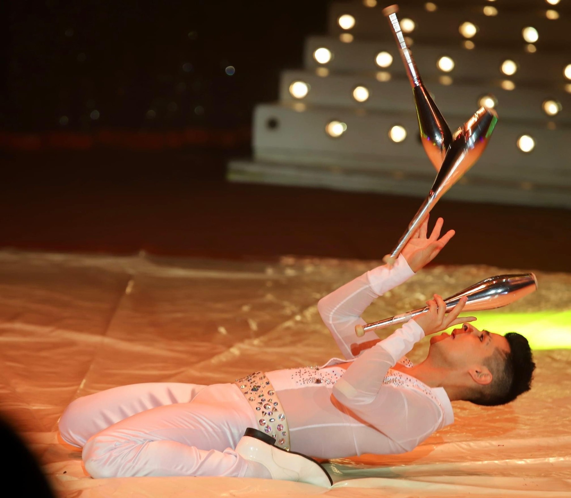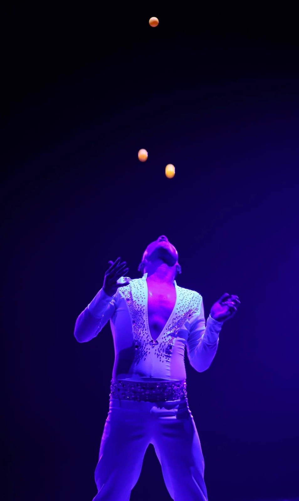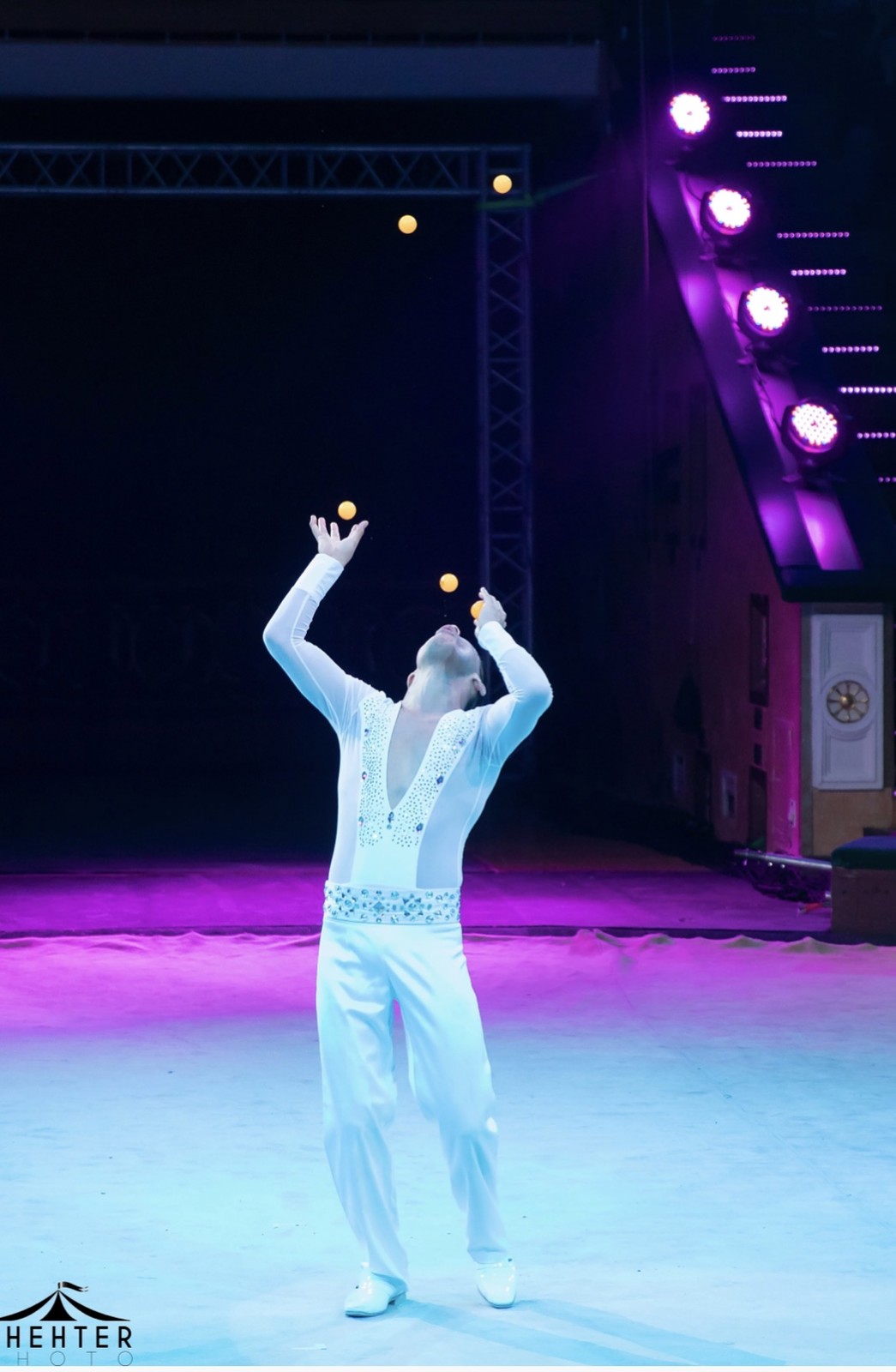 Il peut lancer et rattraper avec la bouche jusqu’à cinq balles de ping-pong et son morceau de bravoure reste la valse des chapeaux qu’il envoie en courant tout autour de la piste !