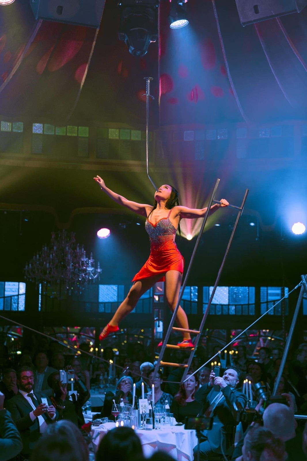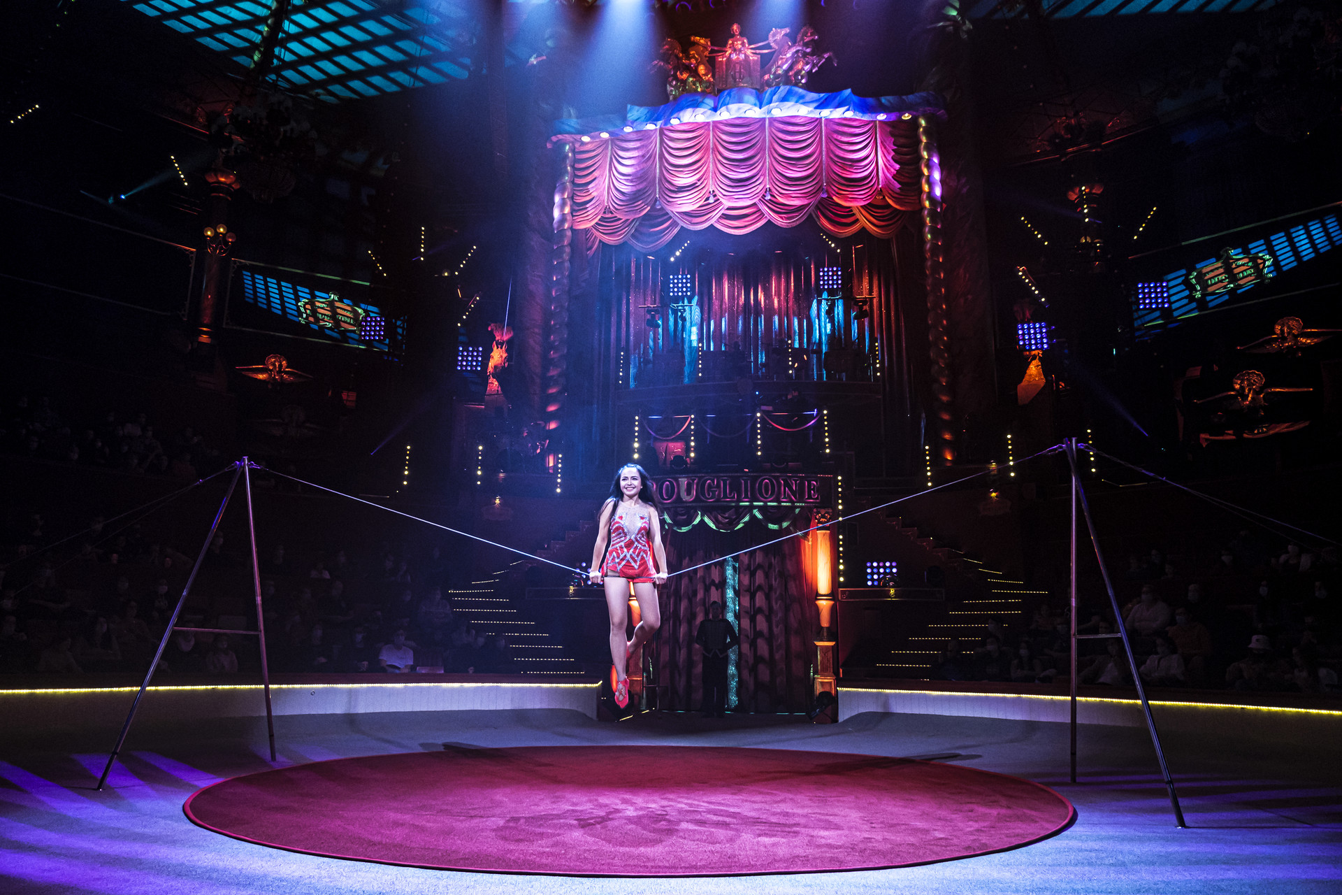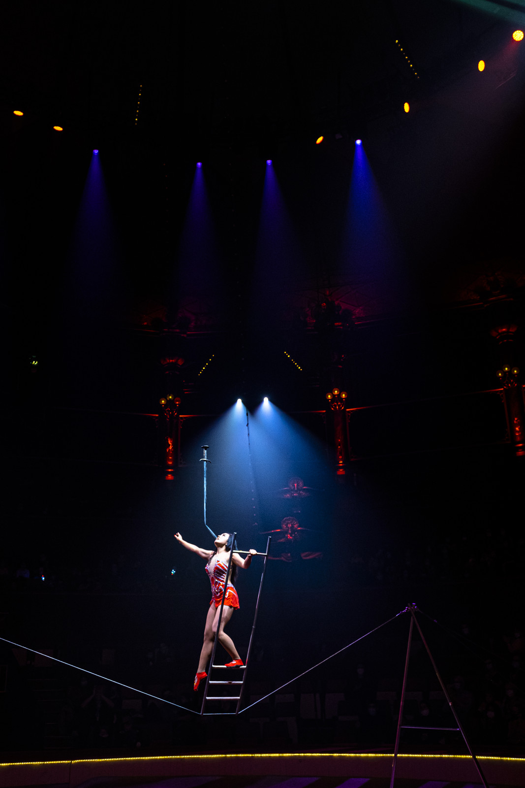 Elle décline son numéro comme une pièce dramatique où elle lutte pour conserver ses équilibres malgré les obstacles de plus en plus infranchissables qui se présentent et elle termine son numéro en ramassant, avec sa bouche, un foulard posé sur son fil tout en restant agenouillée !
